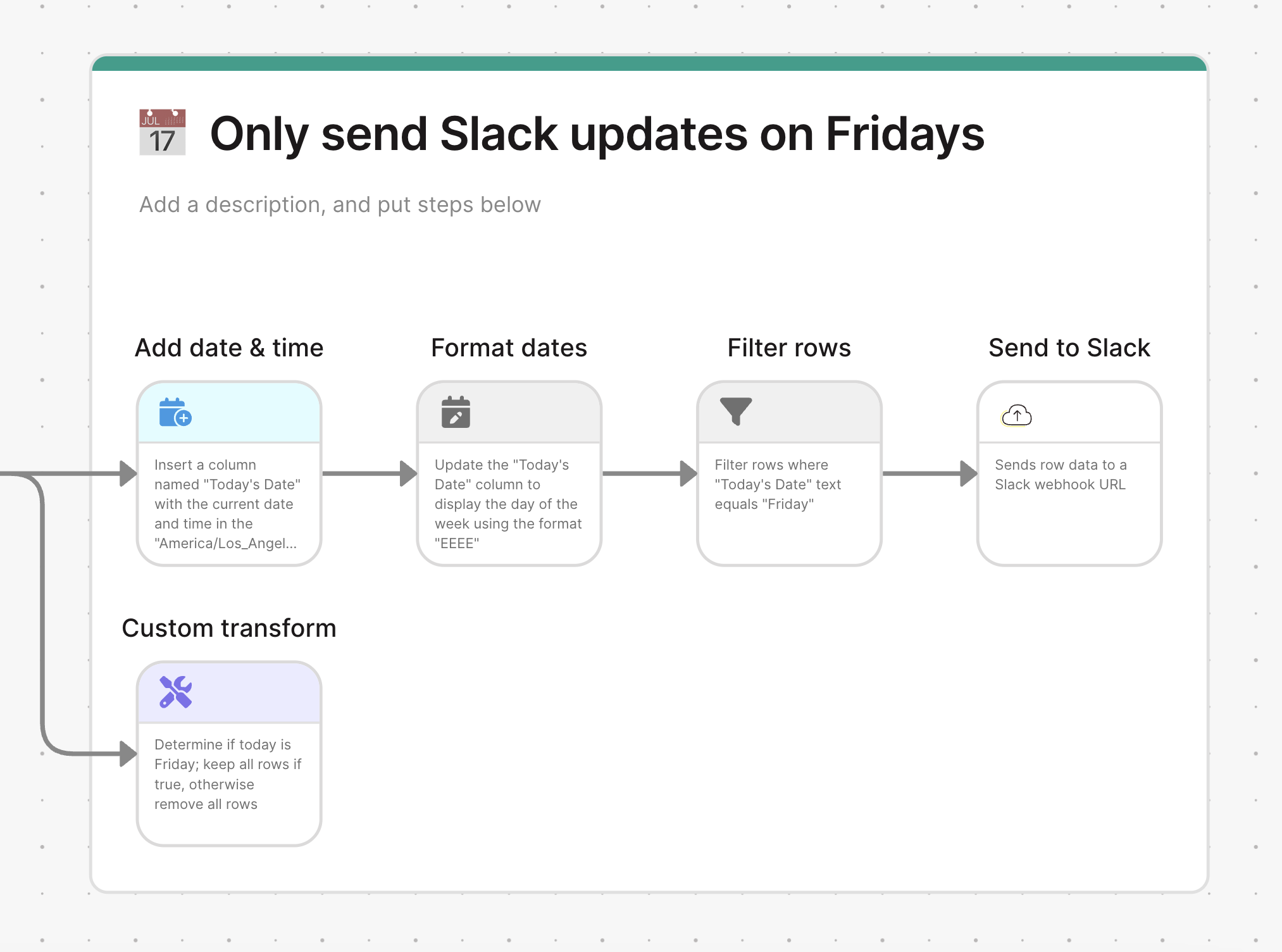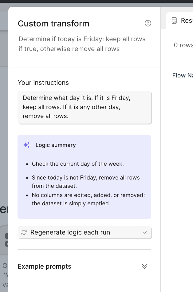 1. Add a Custom Transform step before the actions you want to schedule2. Enter a prompt that specifies your scheduling logic, such as: “Determine what day it is. If it is Friday, keep all rows. If it is any other day, remove all rows.”