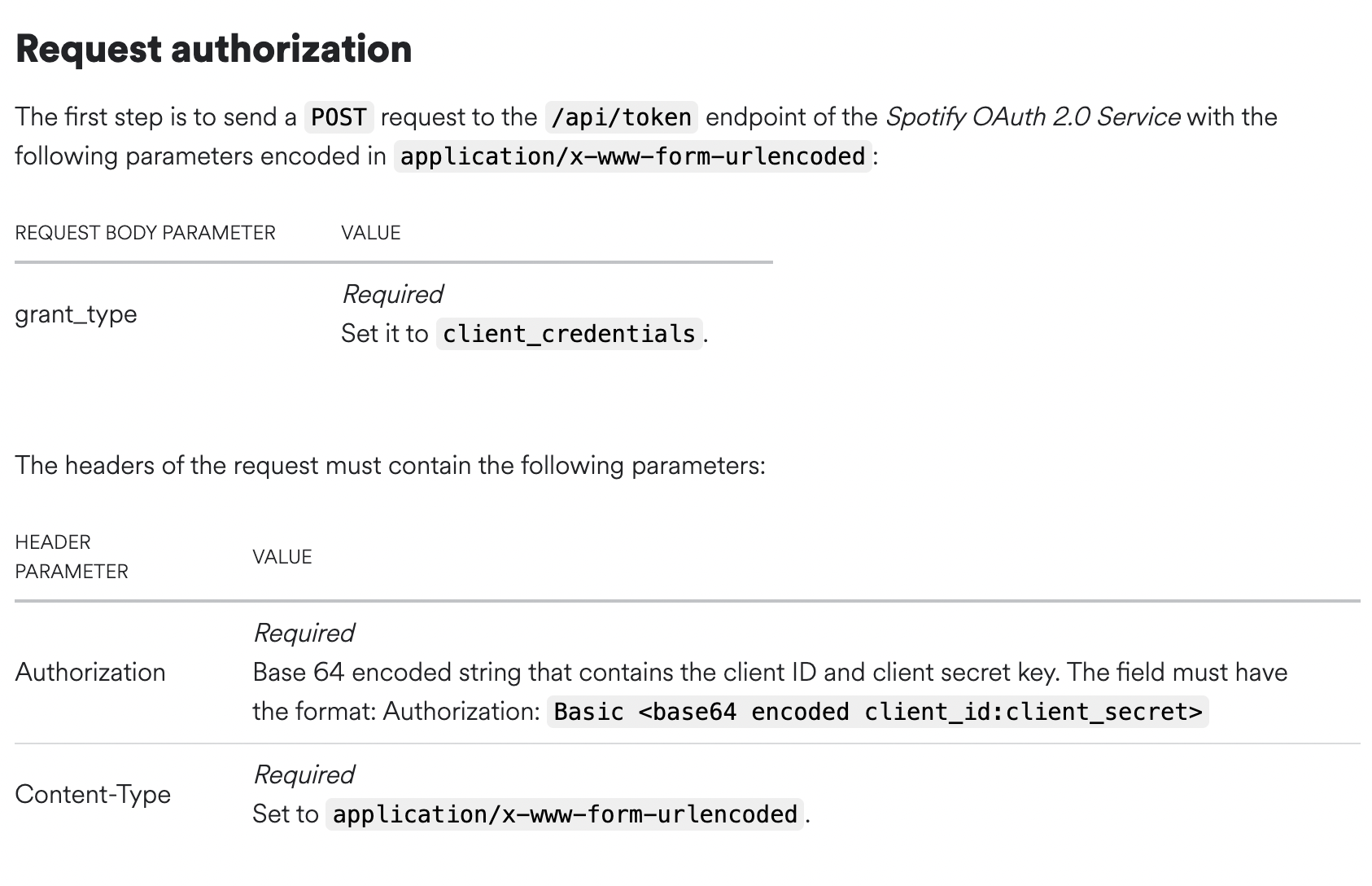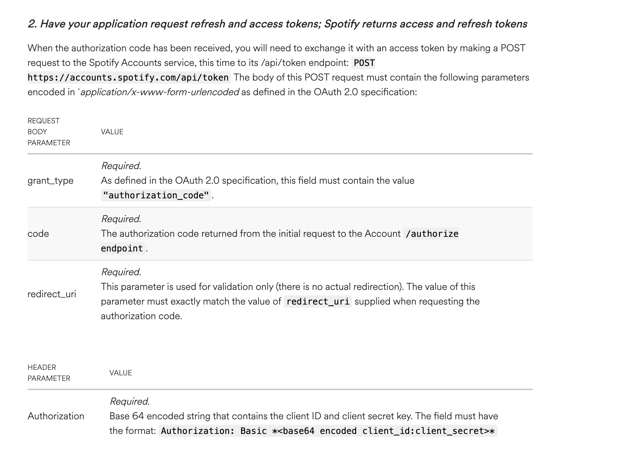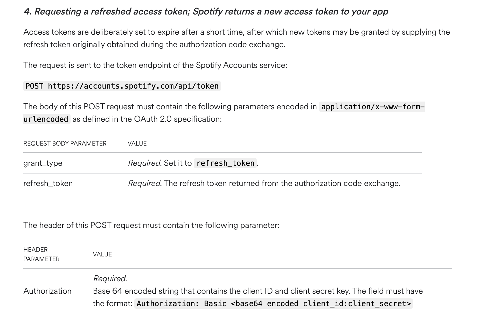 We can add the Refresh Token Request Body to our request by using key:value pairs. The image below shows Spotify requires a grant_type and refresh_token as body parameters.