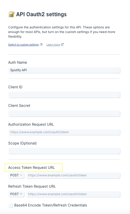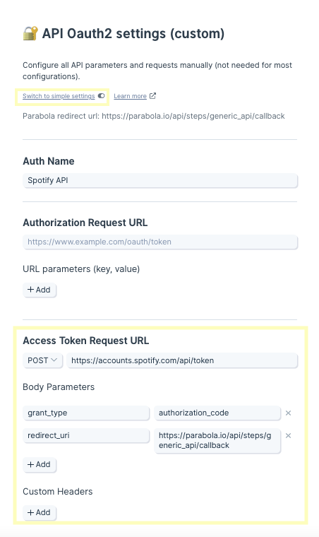 Add a Custom Header if your service requires them. Spotify mentions adding Authorization as the Header Key again. The Header Value is