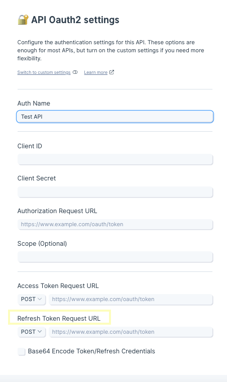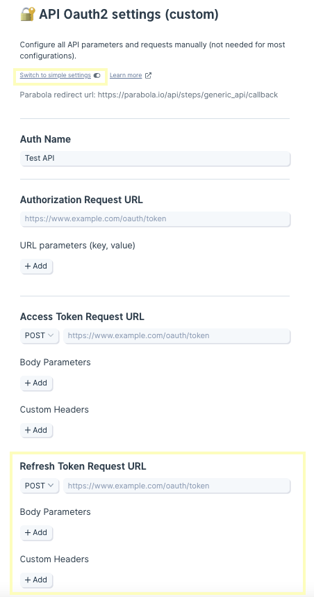 Once Parabola has the token, by default, it will be sent in your API requests as a bearer token. If the API that you’re working with requires a custom header to be used instead of a bearer token, you can use the Advanced Settings.