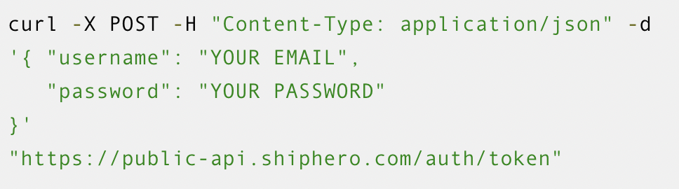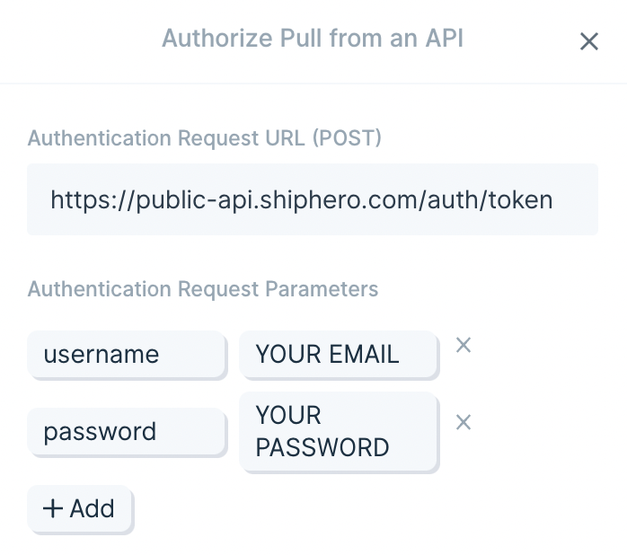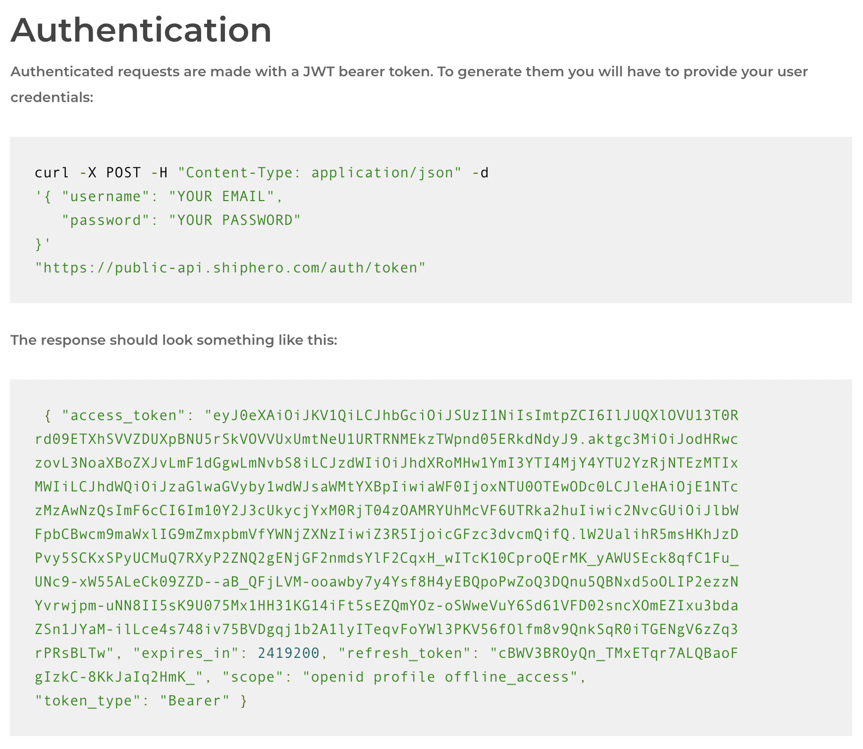 First, let’s look at the authentication request URL and optional authentication request parameters. Any API that uses this auth method will have a URL that you need to send a POST request to in order to get the access token. Put that URL in this field. In the example from the ShipHero docs, they expect us to send a POST tohttps://public-api.shiphero.com/auth/token to get the access token.