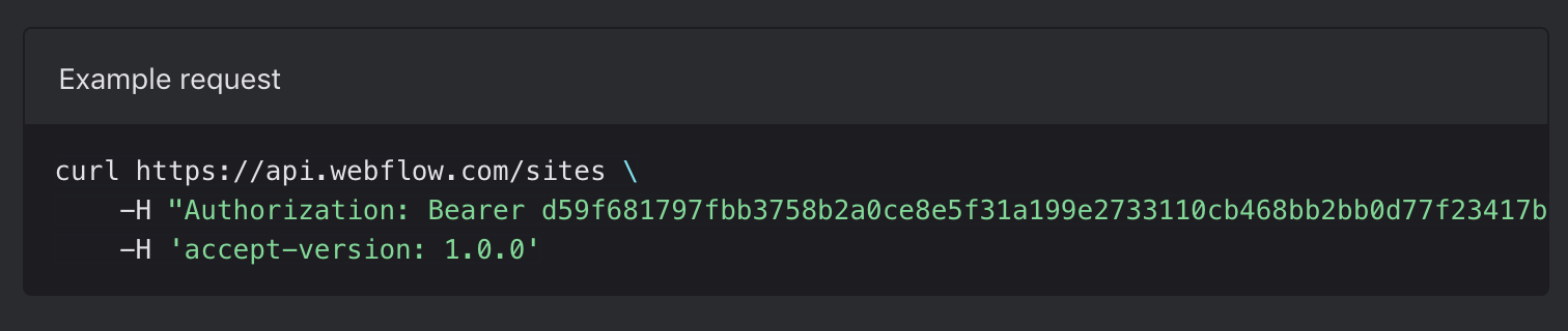 A header is a piece of additional information to be sent with the request to an API. If an API requires additional headers, it is commonly noted in their documentation as -H. Remember the authentication methods above? Some APIs list the authentication type to be sent as a header. Since Parabola has specific fields for authentication, those headers can typically be ignored. Taking a look at Webflow’s API, they show two headers are required.