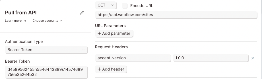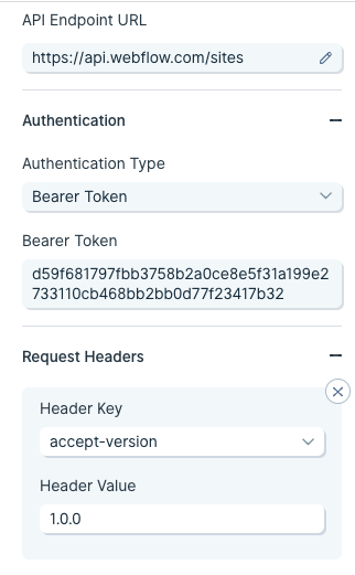 A header is a piece of additional information to be sent with the request to an API. If an API requires additional headers, it is commonly noted in their documentation as -H. Remember the authentication methods above? Some APIs list the authentication type to be sent as a header. Since Parabola has specific fields for authentication, those headers can typically be ignored. Taking a look at Webflow’s API, they show two headers are required: