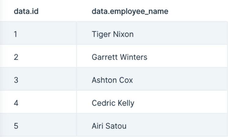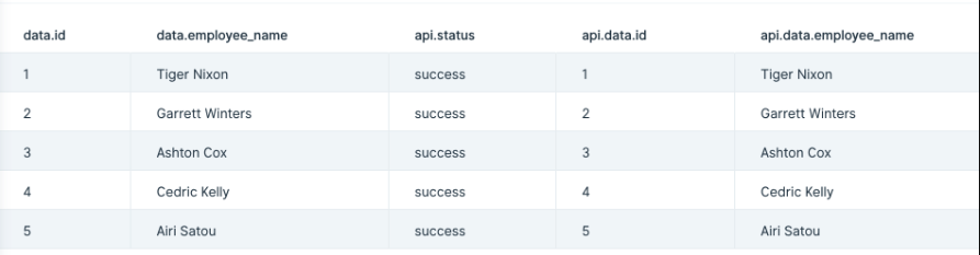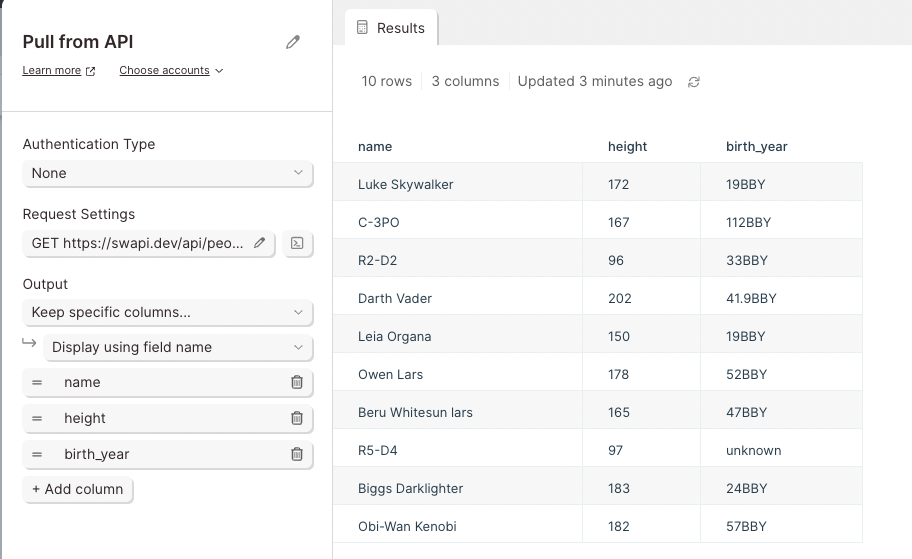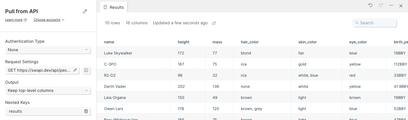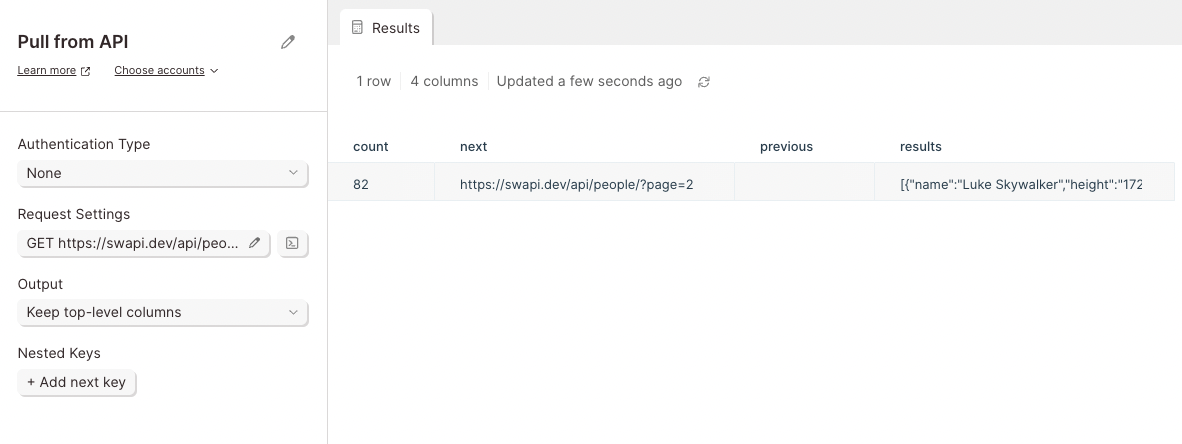 APIs typically to structure data as a nested objects. This means data can exist inside data. To extract that data into separate columns and rows, use the Output section to select a top-level column. For example, a character can exist as a data object. Inside the result object, additional data is included such as their name, date of birth, and location.