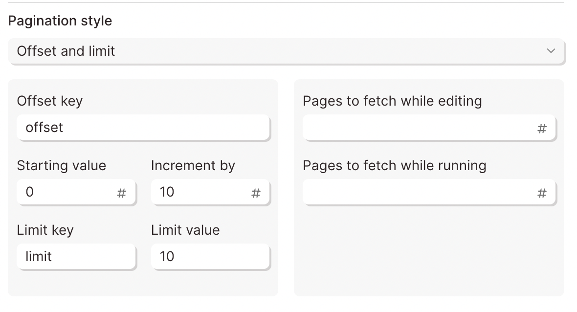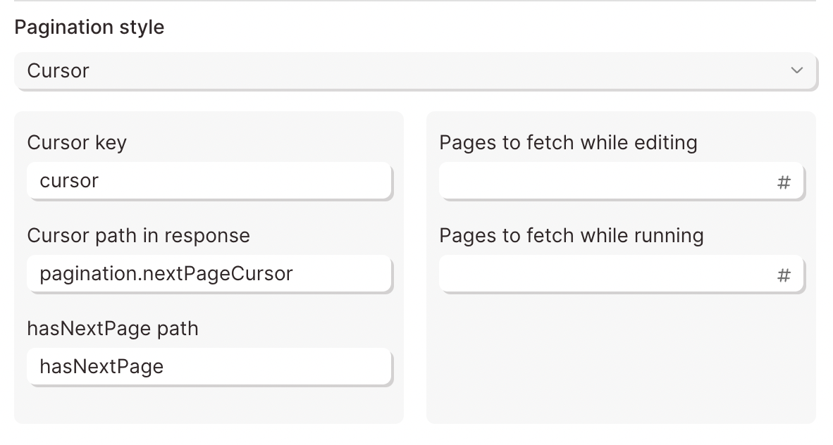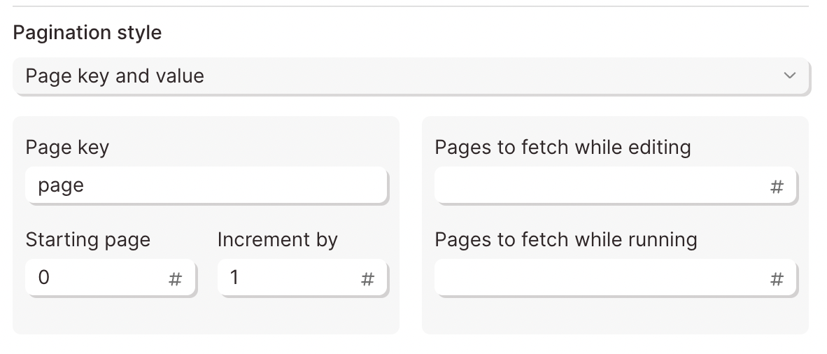 APIs return data in pages. This might not be noticeable for small requests, but larger request will not show all results. APIs return 1 page of results. To view the other pages, pagination settings must configured Each API has different Pagination settings which can be searched in their documentation. The three main types of pagination are Page, Offset and Limit, and Cursor based pagination.Page Based Pagination