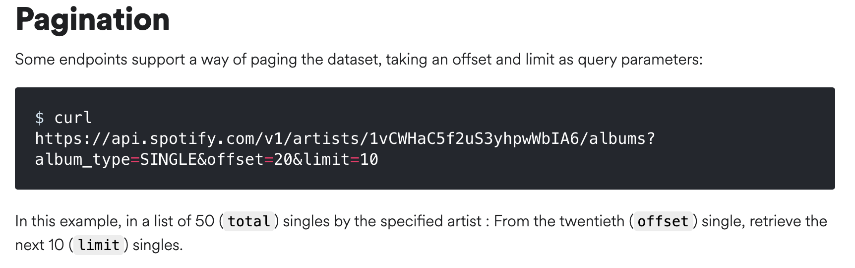 APIs that use Offset and Limit based pagination require each request to limit the amount of items per page. Once that limit is reached, an offset is used to cycle through those pages. Spotify refers to this type of pagination in their documentation: