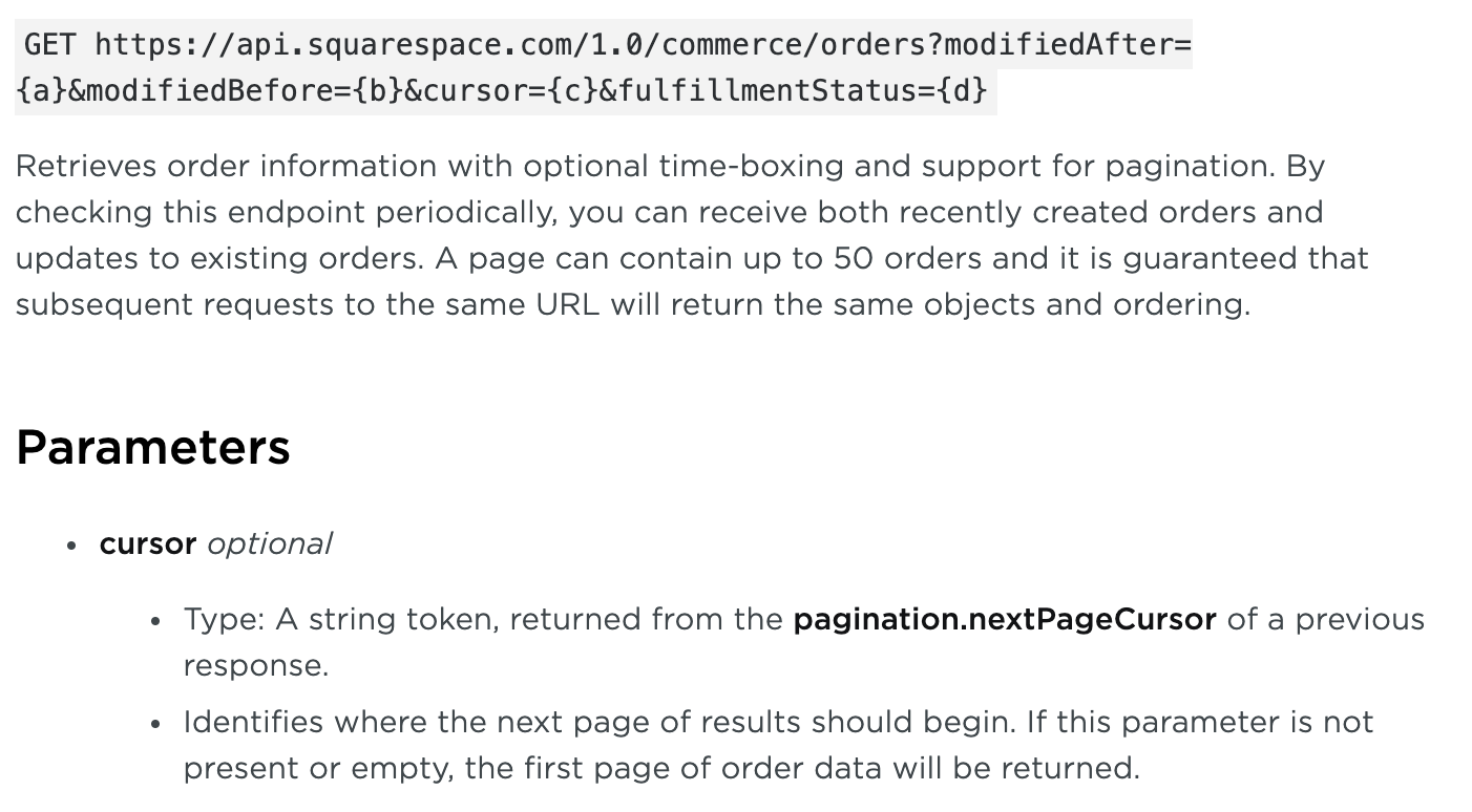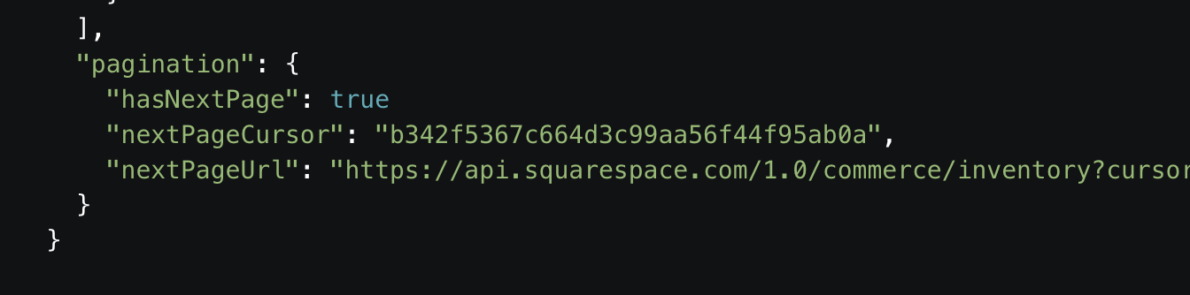 Otherwise known as the bookmark of APIs, Cursor based pagination will mark a specific item with a cursor. To return additional pages, the API looks for a specific Cursor Key linked to a unique value or URL. Squarespace uses cursor based pagination. Their documentation states that two Cursor Keys can be used. The first one is called nextPageCursor and has a unique value: