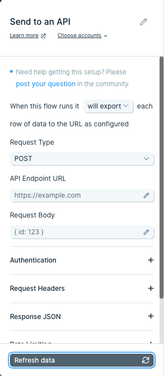 Click “Authorize” to grant Parabola access to your service. If successful, you will be returned to your flow and see that it is ready for use. Now that you are authentication, make a request to the Endpoint URL as you normally would by adding body parameters or custom headers when necessary. The API should now return data to Parabola.Still having trouble?