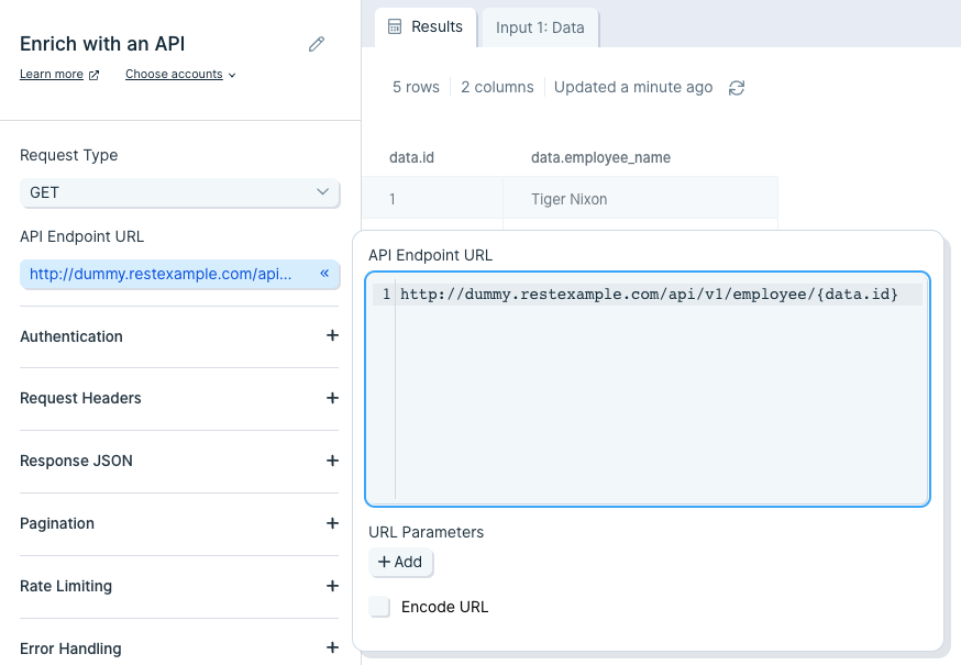 The Pull from an API step sends a request to an API to return specific data. In order for Parabola to receive this data, it must be returned in a CSV, JSON, or XML format. This step allows Parabola to connect to a third-party to import data from another service, platform, or account. You might wonder when it is best to use the Pull from API step vs Enrich with API step. If you need to take existing data and pass it through an API, we recommend you use Enrich with API in the middle of the flow. Enrich with API makes requests row by row. If you just need to fetch data and join it into the middle of a flow, you could use the “Pull from API” step and then a join step.Basic Settings