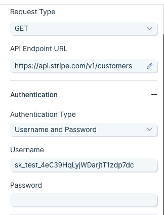 This method is also referred to as Basic Authorization or simply Basic. Most often, the username and password used to sign into the service can be entered here. However, some APIs require an API key to be used as a username, password, or both. If that’s the case, Insert the API key into the respective field noted in the documentation. The example below demonstrates how to connect to Stripe’s API using the Basic Authorization method.