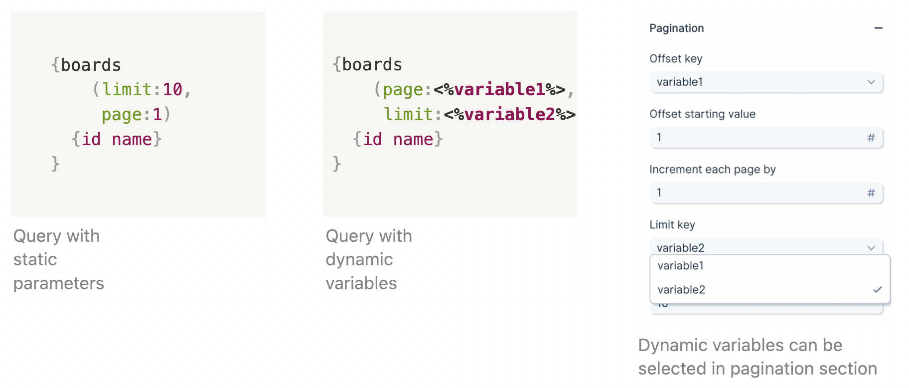 GraphQL is a new type of API that allows Parabola to specify the exact data it needs from an API resource through a request syntax known as a GraphQL query. To get started with this type of API call in Parabola, set the request type to “POST” in any API step, then select “GraphQL” as the Protocol of the request body. Once your request type is set, you can enter your query directly into the request body. When forming your query, it can be helpful to use a formatting tool to ensure correct syntax. Our GraphQL implementation current supports Offset Limit pagination, using variables inserted directly into the query. Variables can be created by inserting any single word between the brackets'<%%>'. Once created, variables will appear in the dropdown list in the “Pagination” section. One of these variables should correspond to your “limit”, and the other should correspond to “offset.”