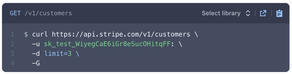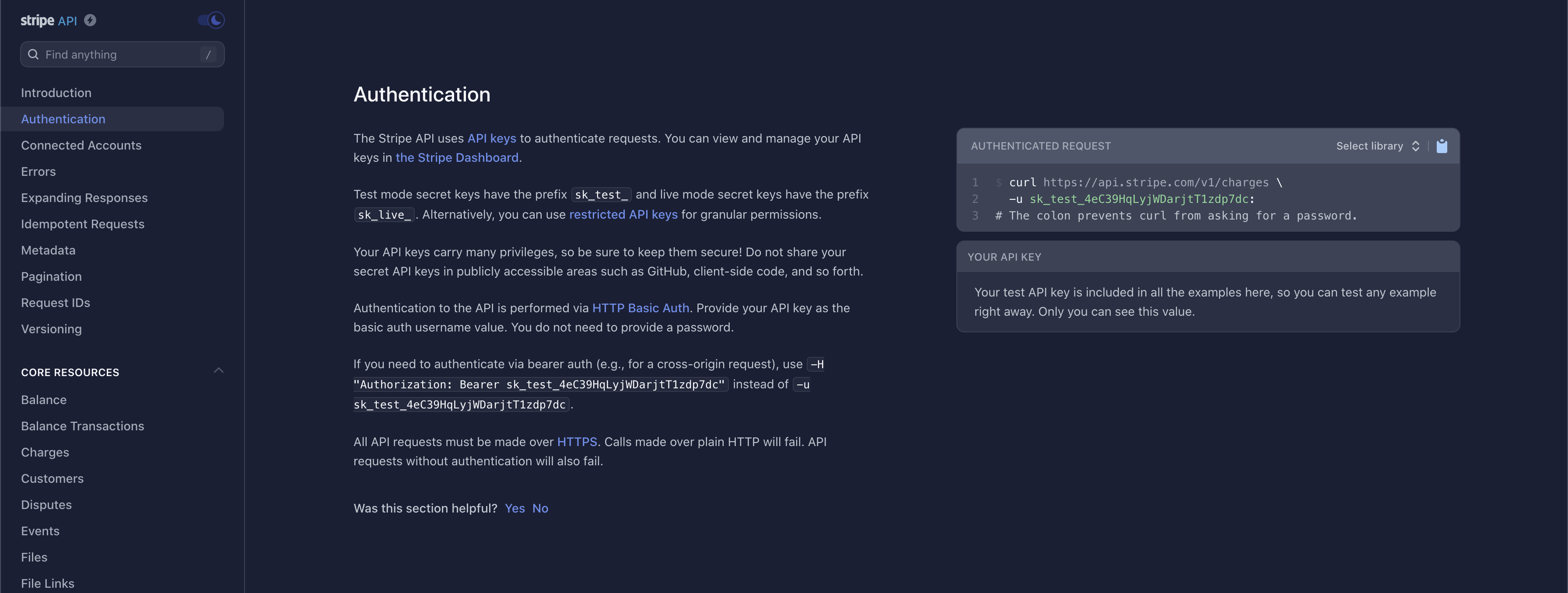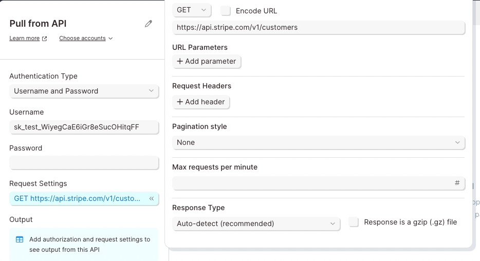 This method is also referred to as Basic Authorization or simply Basic. Most often, the username and password used to sign into the service can be entered here. However, some APIs require an API key to be used as a username, password, or both. If that’s the case, insert the API key into the respective field noted in the documentation. The example below demonstrates how to connect to Stripe’s API using the Basic Authorization method.