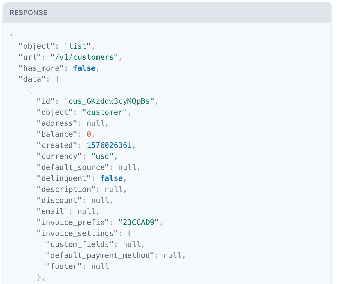 JavaScript Object Notation, or more commonly JSON, is a way for an API to exchange data between you and a third-party. JSON is follows a specific set of syntax rules. An object is set of key:value pairs and is wrapped in curly brackets . An array is a list of values linked to a single key or a list of keys linked to a single object. JSON in API documentation may look like this: