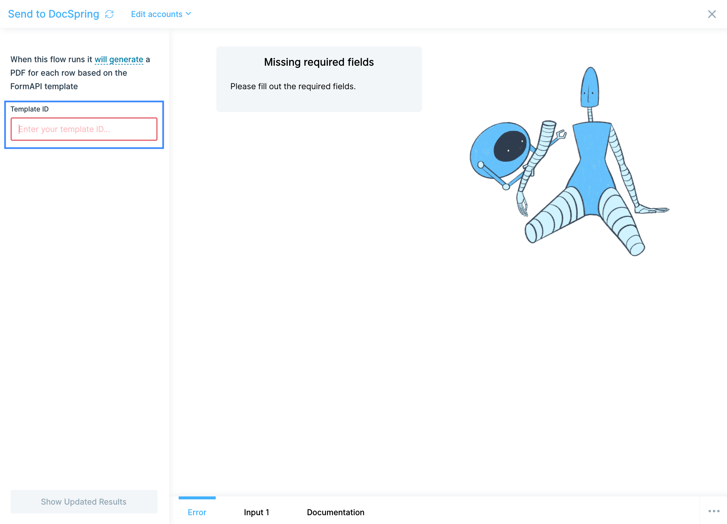 Use the Send to DocSpring step to automatically create submissions for your DocSpring PDF Templates.Connect your DocSpring account