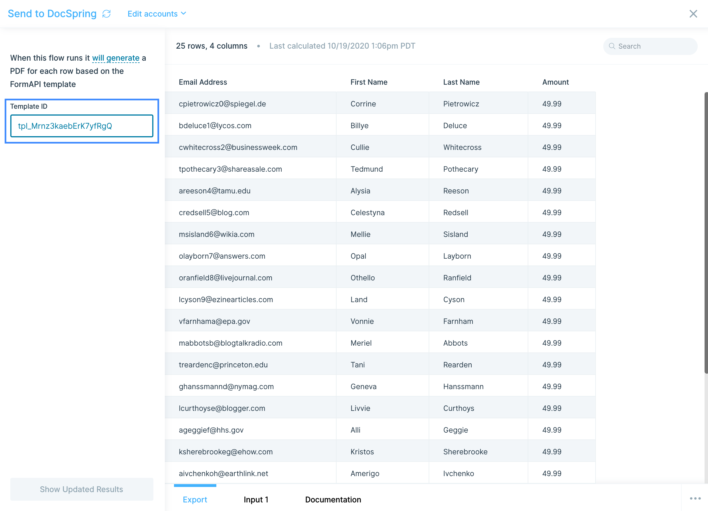 DocSpring is a document generation platform that allows businesses to create and fill PDF forms programmatically. It enables users to automate the generation of invoices, contracts, reports, and other documents using API-driven workflows. DocSpring is widely used for streamlining document-heavy processes, reducing manual data entry, and ensuring accuracy in automated document creation.How to use Parabola’s DocSpring integration