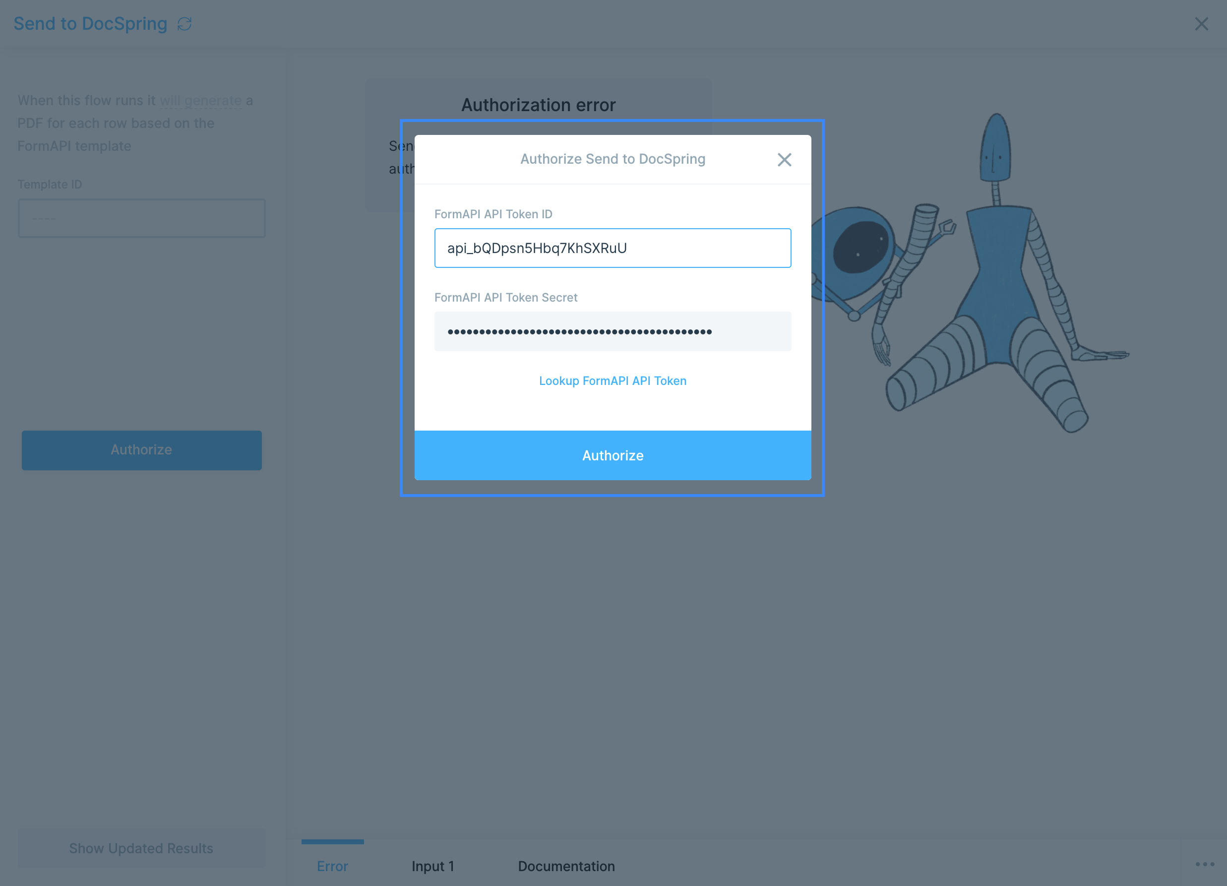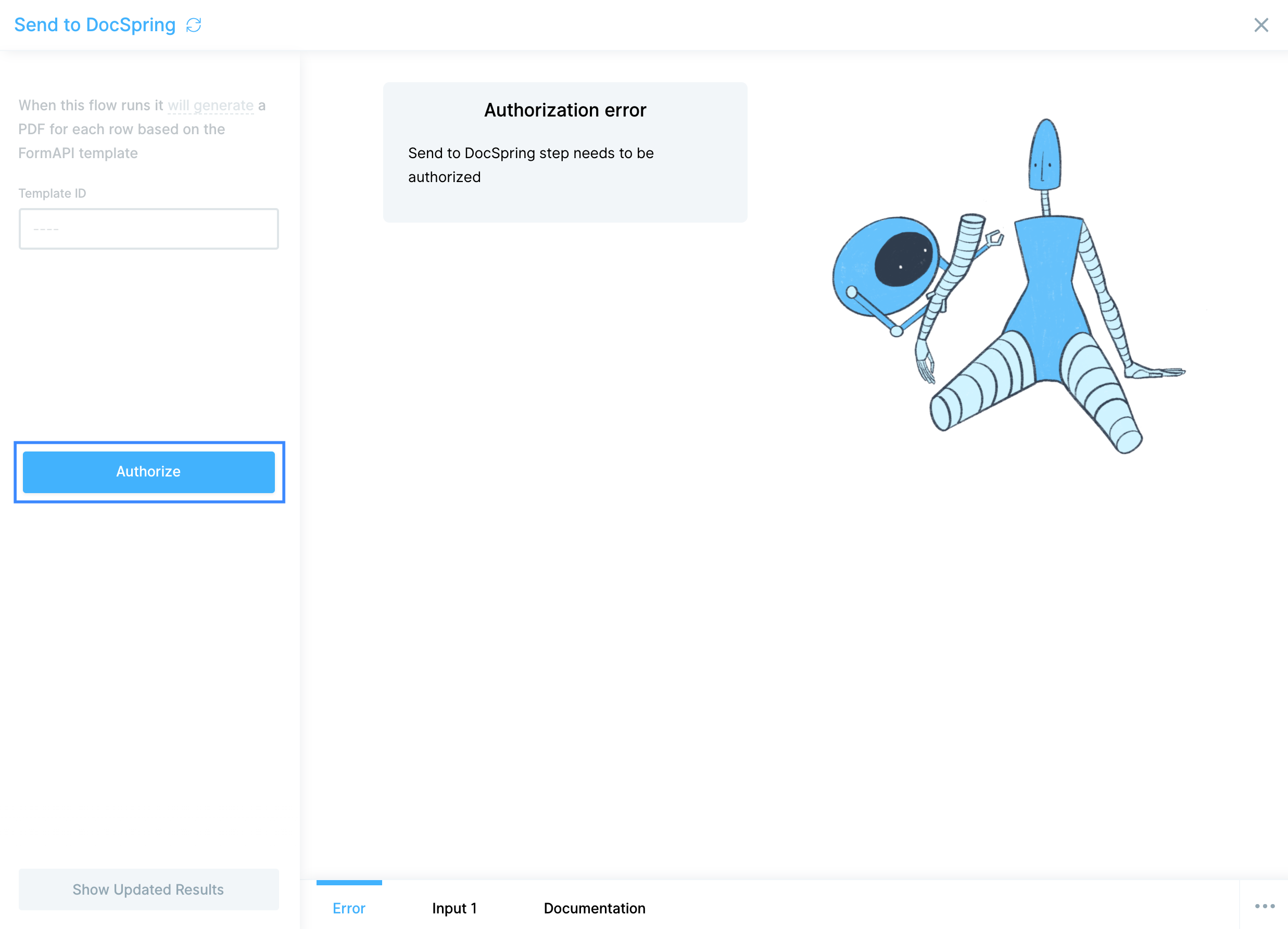 To connect to your DocSpring account, you’ll first need to click the blue “Authorize” button.