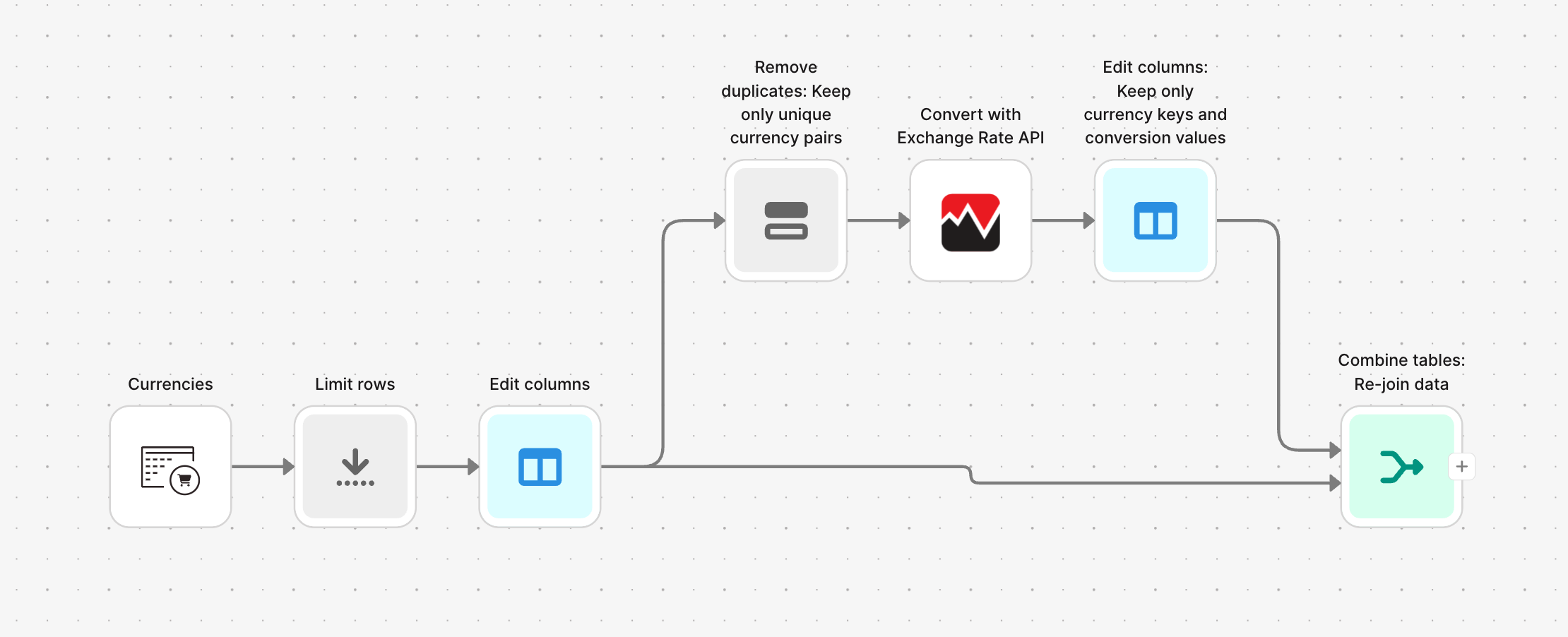 - Reduce API calls by removing duplicates upstream: Before pulling conversion rates, use Parabola’s Remove duplicates step on your currency pair columns to eliminate redundant requests. This helps you stay within your monthly quota, especially on the free plan.