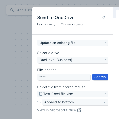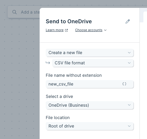 The Send to Microsoft OneDrive step gives you the ability to automate sending custom datasets to OneDrive. You can create a new file or update a file by having the dataset overwrite or append (add on) to an existing file.Connect your OneDrive account