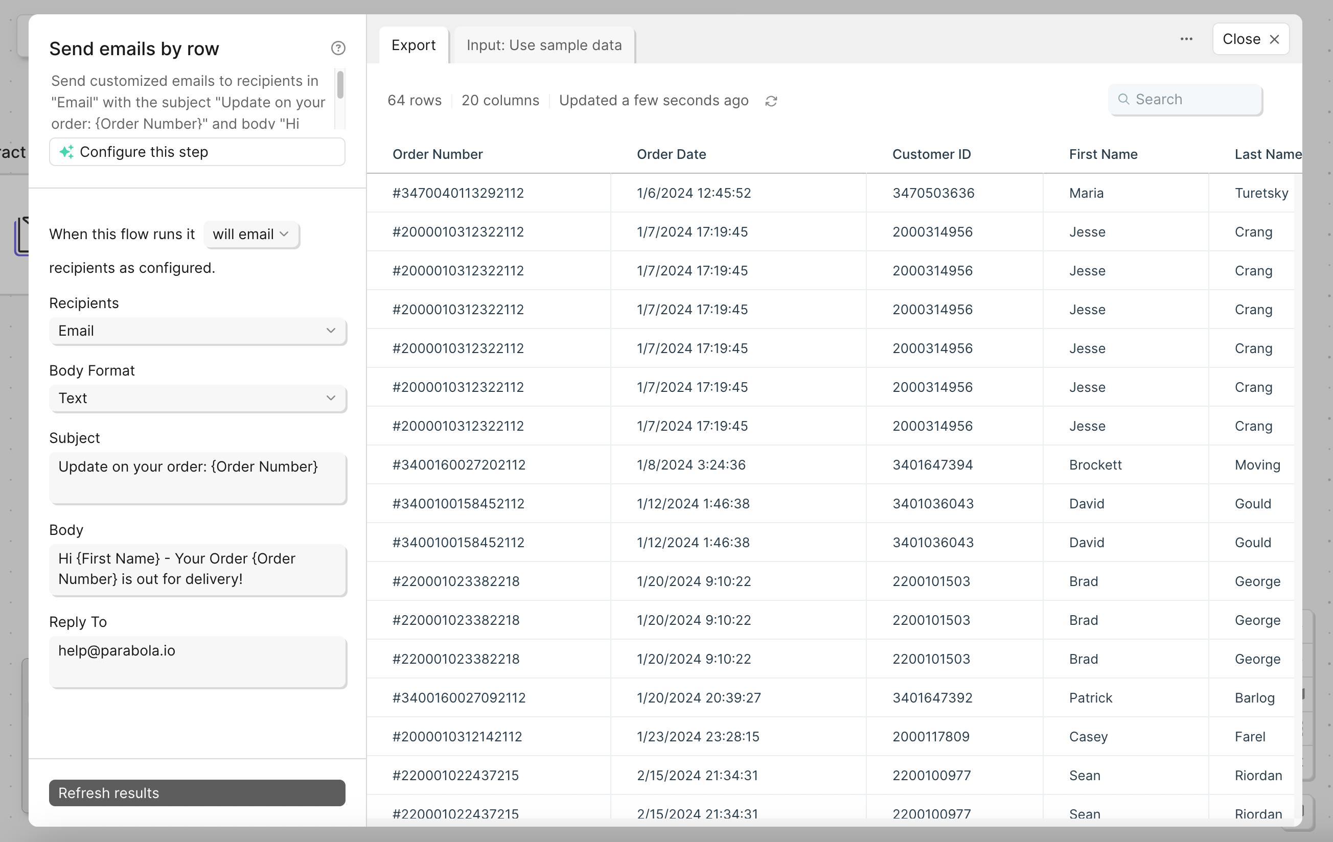 The Send emails by row step sends one email per row in your dataset using the email address listed in a specific column. This is useful for sending personalized messages to a list of recipients. The step supports up to 75 emails per run and all messages are sent fromteam@parabolamail.io, with a footer that says “Powered by Parabola.”