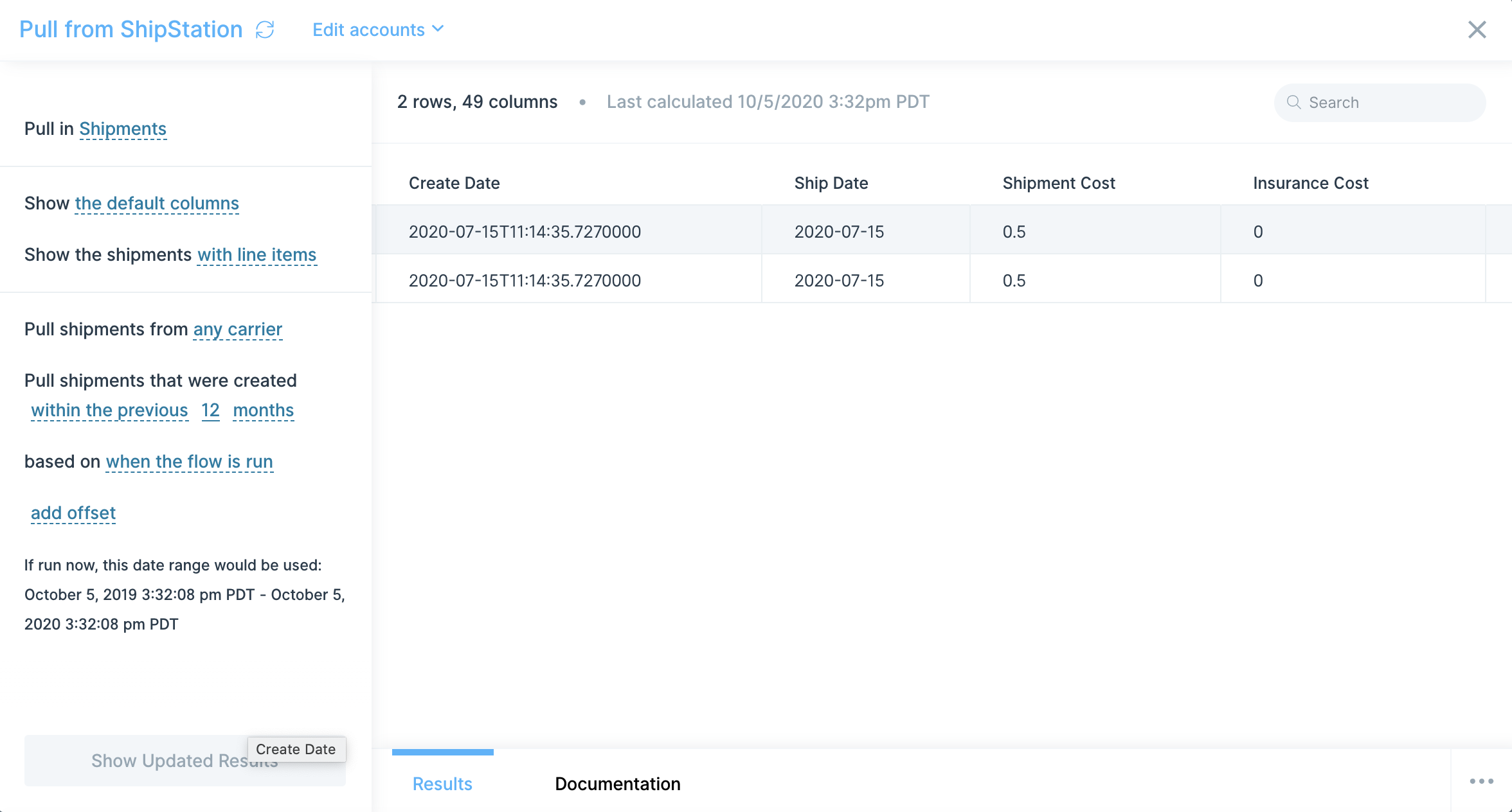 By default, thstep will pull in Orders that were created within the last week. The orders pull defaults to also pulling in the line items for each order. This means that each row represents an item in an order. You can also pull in Shipments and Fulfillments. Across Orders, Shipments, and Fulfillments, you can modify the time frame, default or all columns, and you can filter based on things like status and carrier.Custom settings