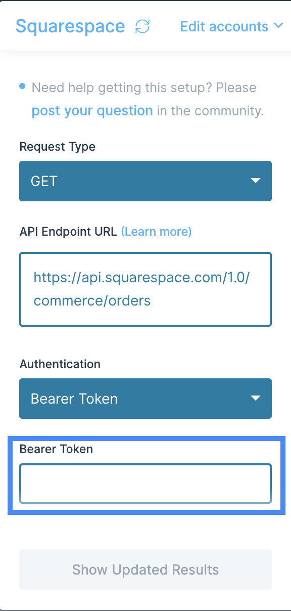 Connecting to the Squarespace API is straightforward. You will need to provide anAPI Key from your Squarespace account. Head here for instructions from Squarespace on generating an API key.