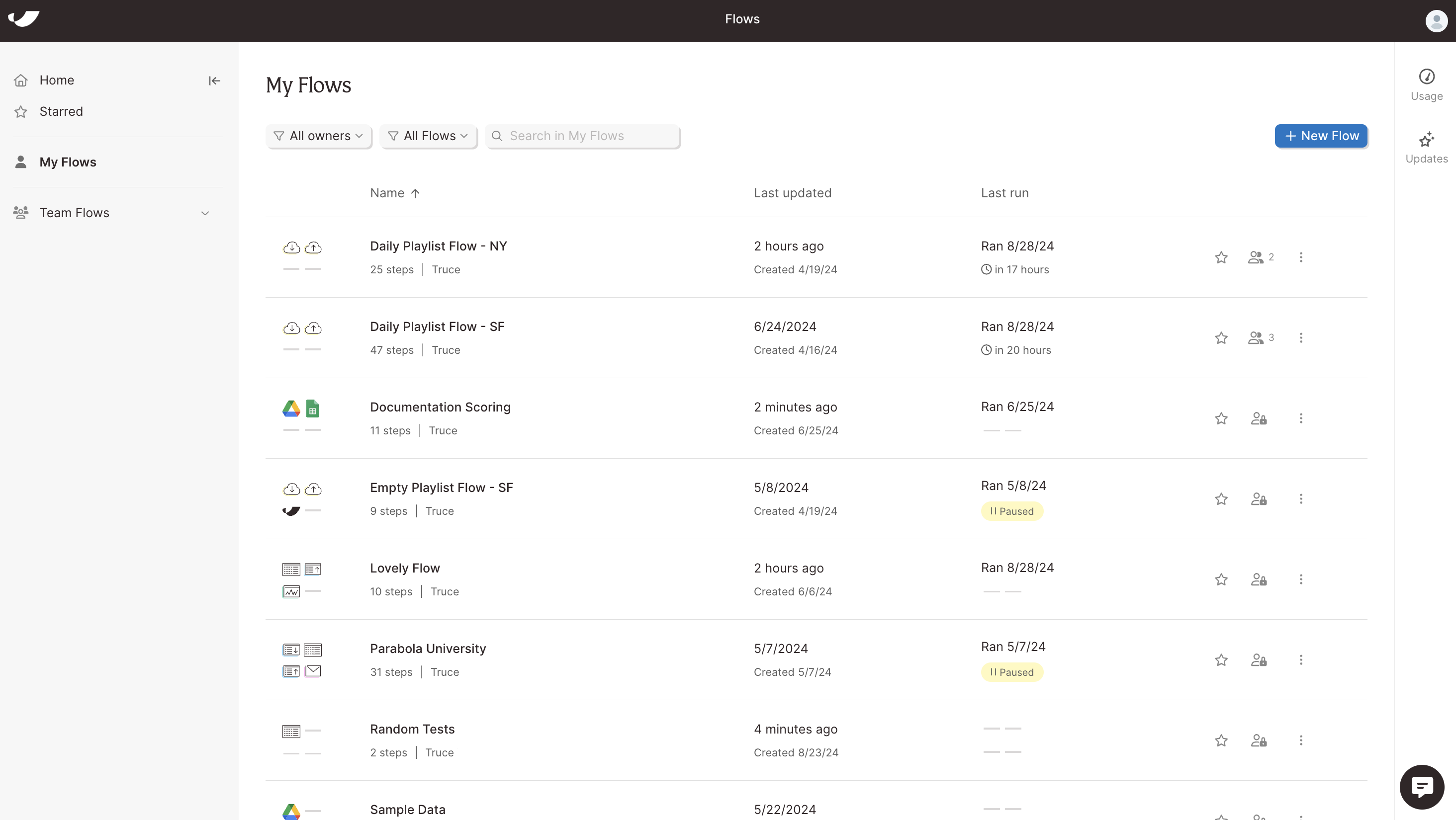 Home is your default landing page in Parabola. It lists the flows you accessed most recently.