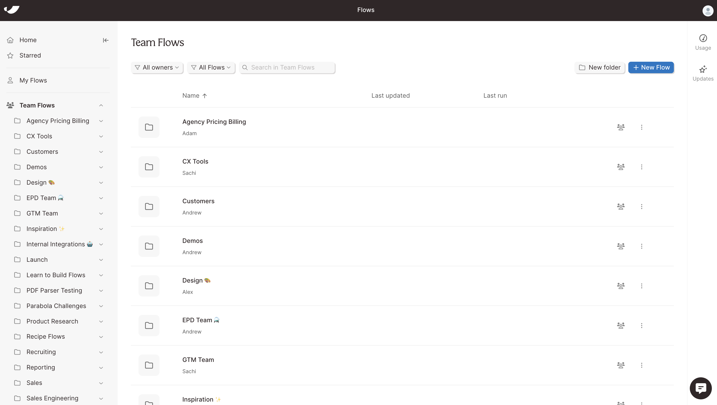 Team flows can be grouped into folders. Anyone on your team can create a folder, and all folders will be accessible to your entire team. To create a folder, click the “New Folder” button and enter a folder name. You or your teammates can later modify the folder name or description from its overflow menu.