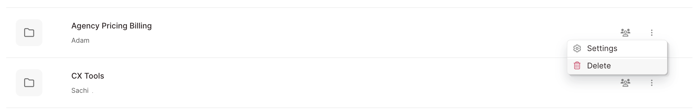 Deleting a folder will also delete its contents (the flows contained within). A folder can only be deleted by the folder creator, and only if they are also an Editor of all of the flows contained within. To delete a folder, go to its parent folder, and select “Delete” from the folder’s overflow menu: