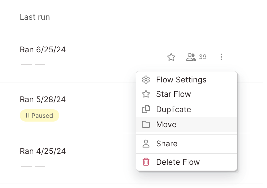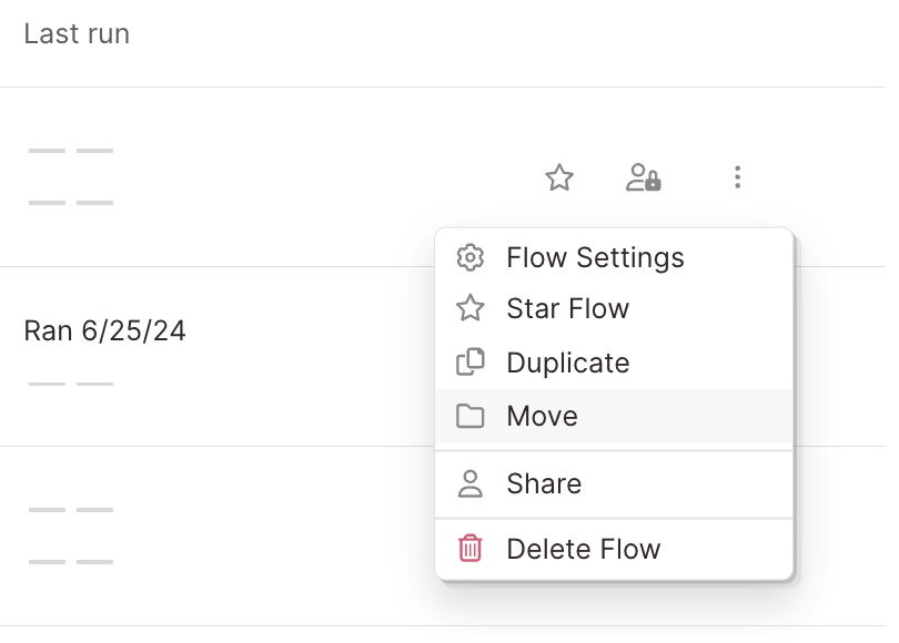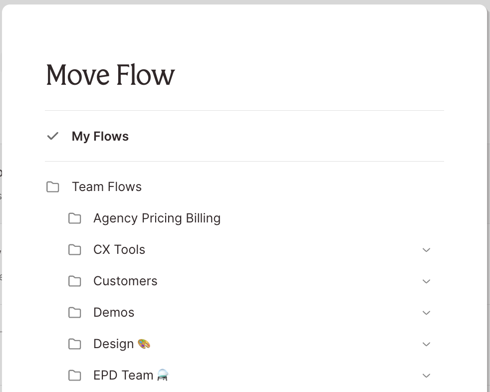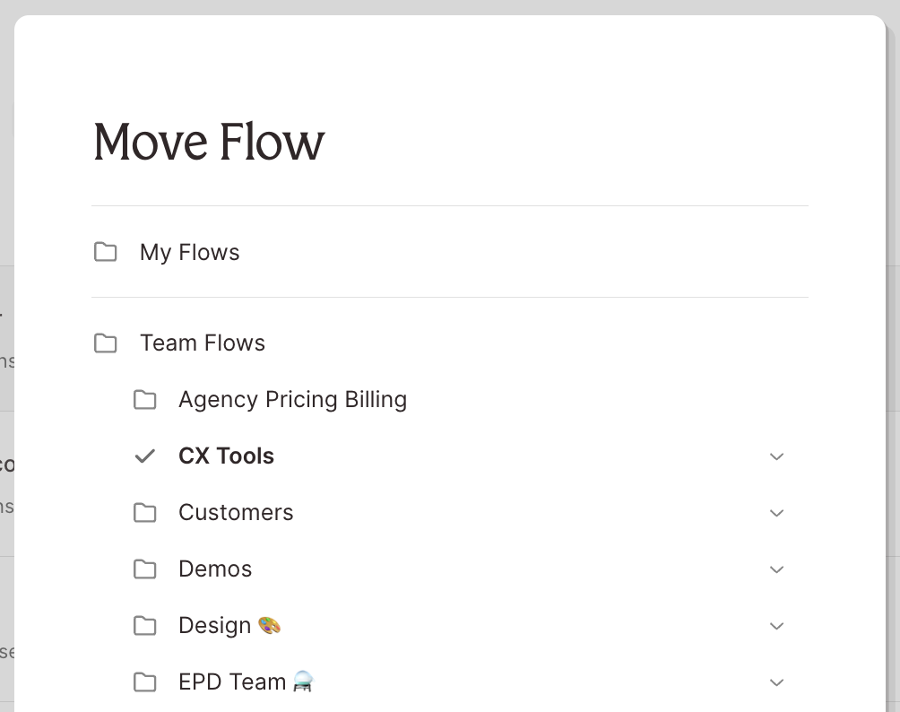 Flows can be moved between “My flows” and “Team flows”. To move a flow, select “Move” from the overflow menu, and choose the desired location. (Note, only flow editors can move flows.) You will see a warning if moving the flow will change who has access to it. This could happen in two ways.Moving a flow into “Team flows”: