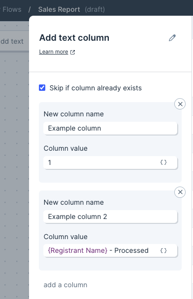 - You can create multiple columns with this step by going to the left-side toolbar and clicking ‘add a column’ under the settings for your new text column.