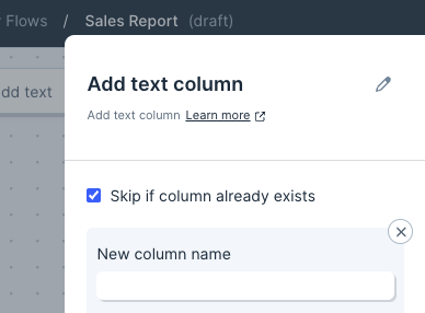 - If the column this step is adding already exists, then by default it won’t be added to your dataset. This can be turned on and off. This is useful for preventing flow errors you set on a schedule, where the data pulled in varies at times.