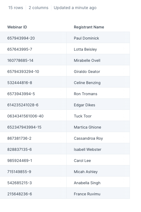 Our sample input data has two columns: ‘Webinar ID’ and ‘Registrant name’.