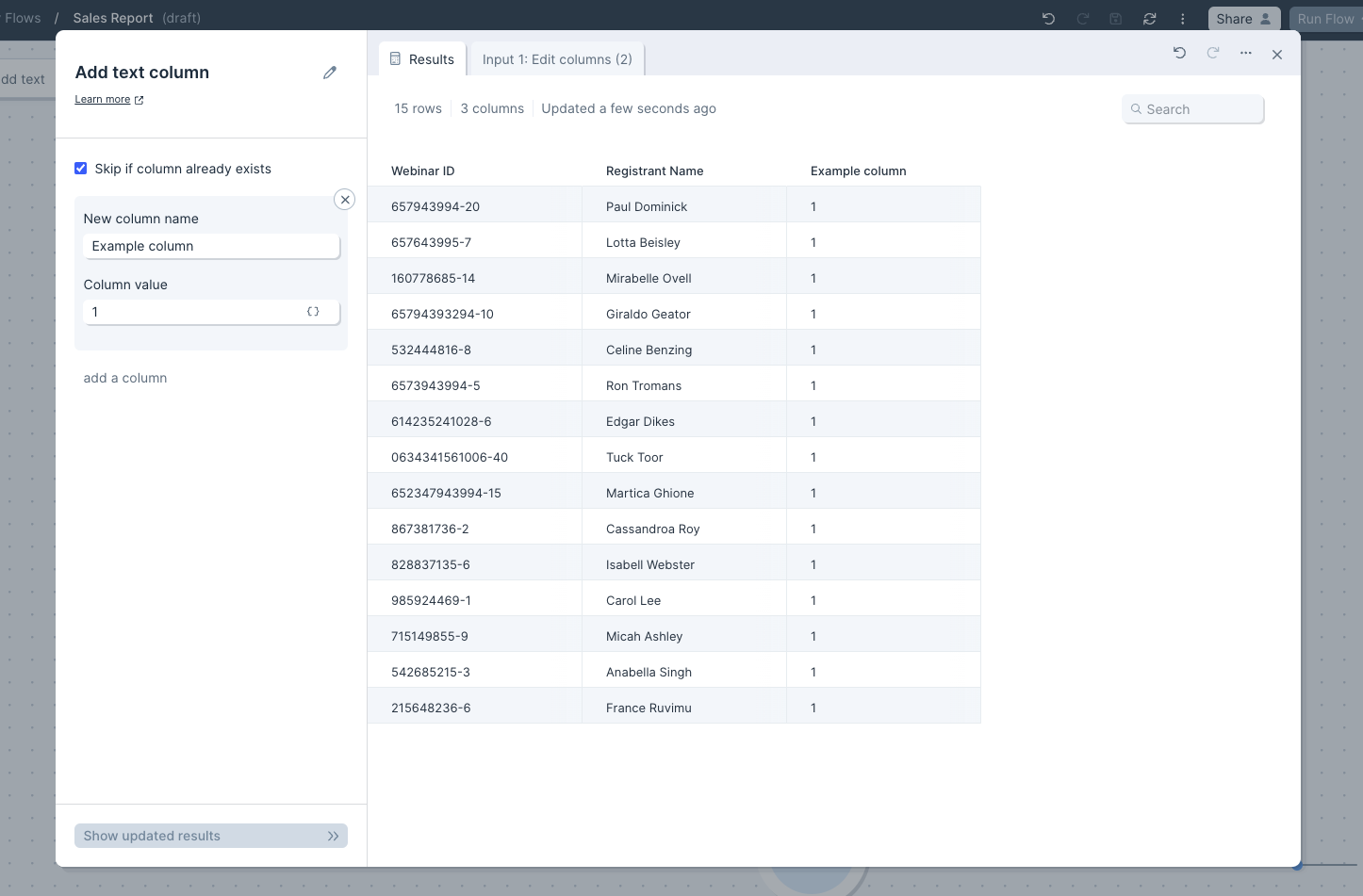 Title your new text column in the ‘New column name’ field. In the ‘Column value’ field, fill in the repeating value you’d like for the rows. Click on ‘Show Updated Results’ to save and display your changes. Using the ‘Skip if column already exists’ checkbox, you can choose to have this column added only if it doesn’t already exist in your dataset. This is useful when working with API steps where the column structure may change based on the available data. Similarly, if you have flows running on a schedule that pull in data at varying periods, this step can be used to create a static column of values so your flow doesn’t stop running due to data temporarily not brought in.