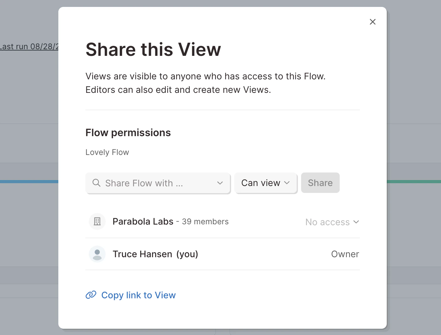 Anyone with access to your flow will be able to see the flow dashboard:- “Can edit”: any teammate with edit permissions can create and edit data views. Any changes to views will be visible immediately to anyone else who has access to the flow.