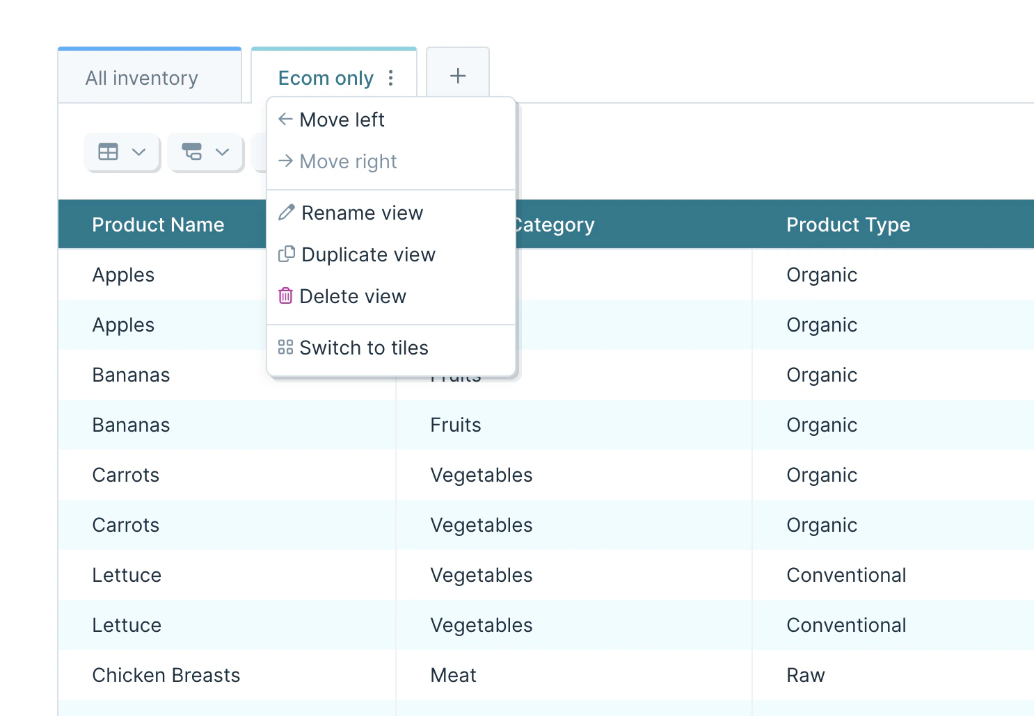 - Add new views by clicking the plus icon to the right of the last tab view, or by clicking the large “Add view” button below the last tile view. If you have too many tab views to see the icon, use the tab list menu on the right side of the table