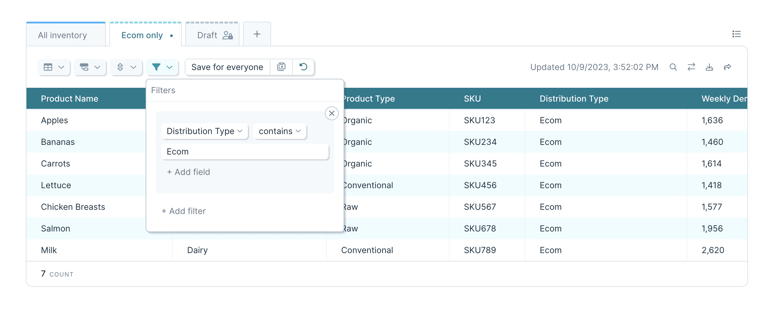 Click the “Sort” button to quickly add a new sort rule (or the view options menu). These sorts define how rows are arranged in the view.Filters