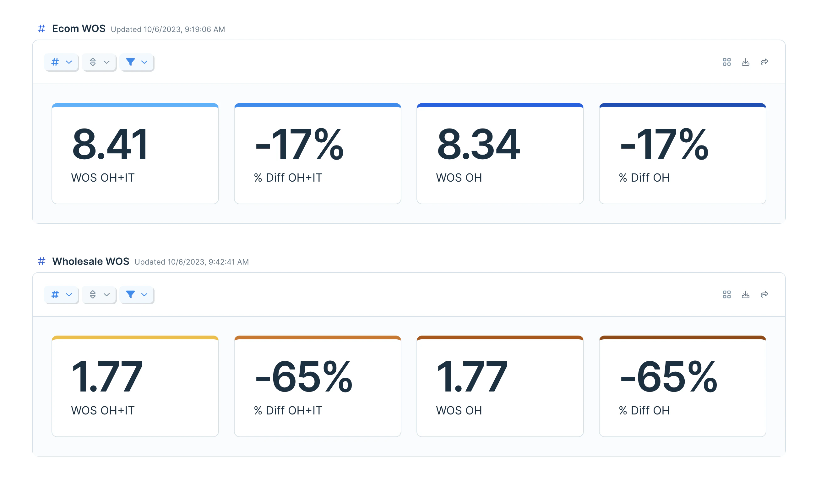 Featured metrics allow you to display specific column calculations from the underlying table. Metrics can be renamed, given a color theme, and formatted (date, number, percent, currency, or accounting). The metrics options menu is in the same placement as above, represented with a ’#’ symbol.