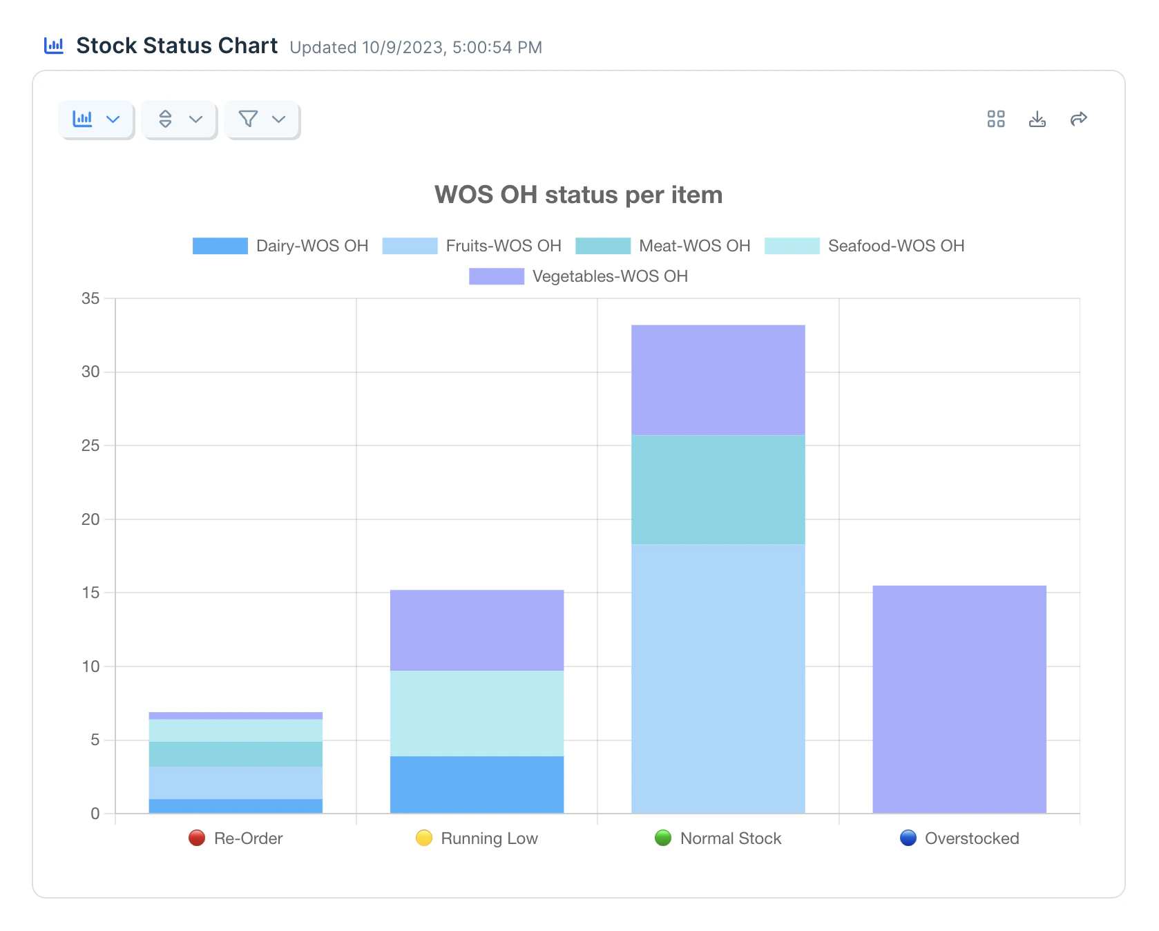 Many charts and graphs have category and stacking options. Depending on your previous selections with the X and Y axes, and the chart type, some options will be available in this menu.- “Categorize by …” will allow you to further split a Y axis value according to a subcategory that exists in your dataset. For example, you could categorize total revenue by store location to see a bar of total revenue for each store location.
