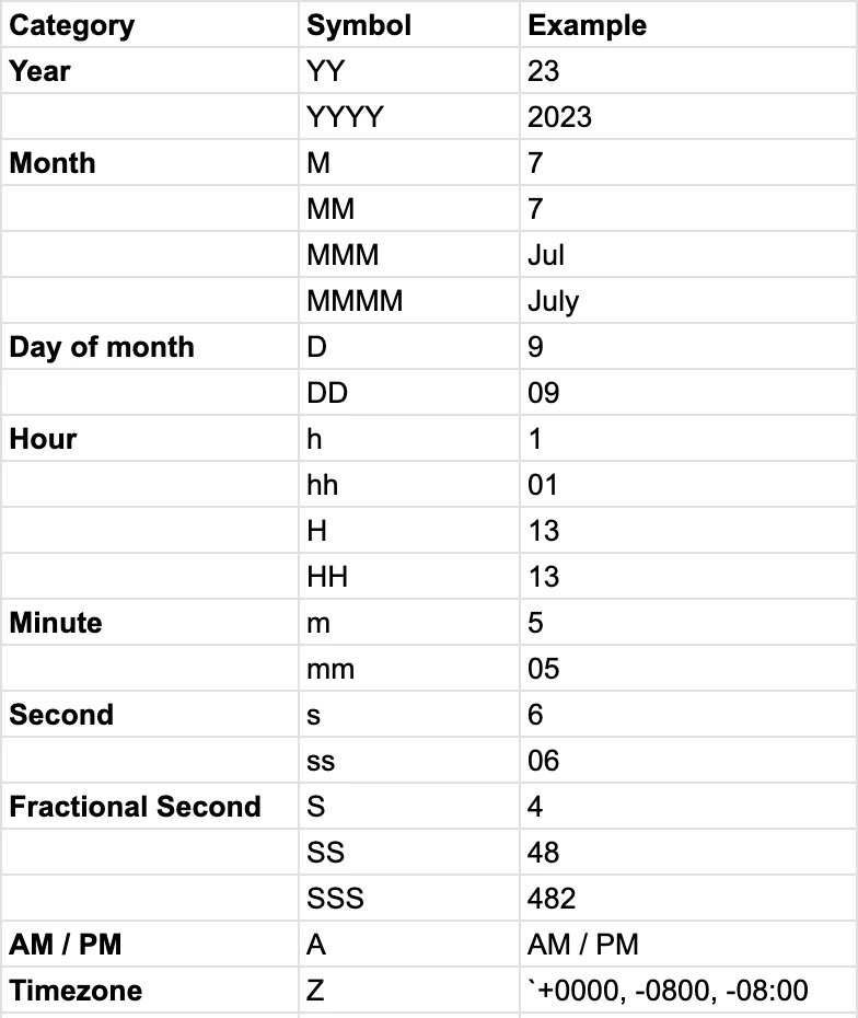 Columns, metrics, and axes can be formatted to change how their data is displayed and interpreted. Click the left-most of your configuration buttons, the “Table/Chart Options” button, to apply formatting to any column, metric, or axis. You can select auto-format, or choose from a list of categories and formats within those categories. In charts, the X-axis will be auto-formatted, and you can change the format as needed. All series in each Y-axis will share the same format. Axis formatting can be adjusted by clicking the gear icon next to the axis name. Formats will be used to adjust how data is displayed in the columns of a table, in the aggregations applied to groups and in the grand total row, and to featured metrics. When grouping a formatted column, the underlying, unformatted value will be used to determine which row goes in which group. When working with dates, the format is autodetected by default. If your date is not successfully detected, click the 3 dots next to the output format field and enter a custom starting format.