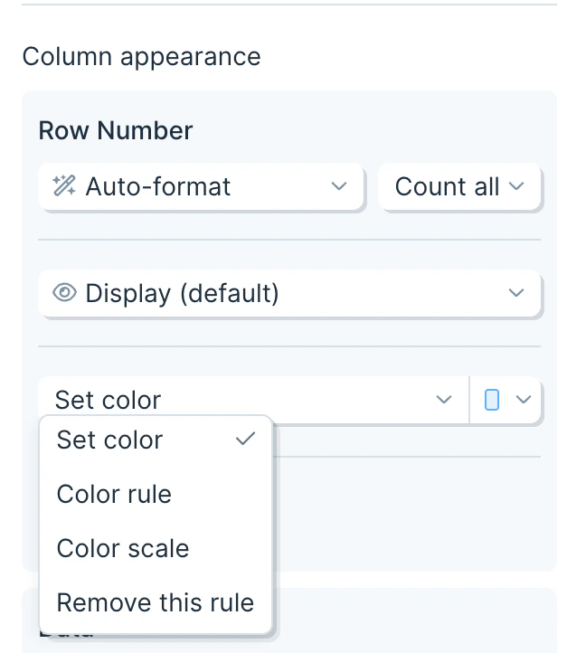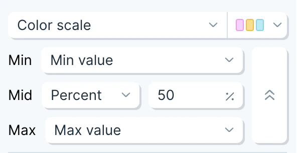 Applies a 2 color or 3 color scale to every cell in the column. All cells will have a color applied. When using two colors, by default the first color will be applied to the minimum value and the second color will be applied to the maximum value. When using three colors, by default, the middle color will be applied to the value 50% between the smallest and largest value in the column. Cells with values between the minimum, maximum, and middle value (if using 3 colors) will blend the colors they are between, creating a smooth gradient. When setting a custom value for the maximum or minimum on a color scale, any value in the table that is larger than the maximum or smaller than the minimum will have the the maximum color or minimum color applied, respectively. Click the ellipsis menu next to the format dropdown to access controls to adjust how the scale is applied.