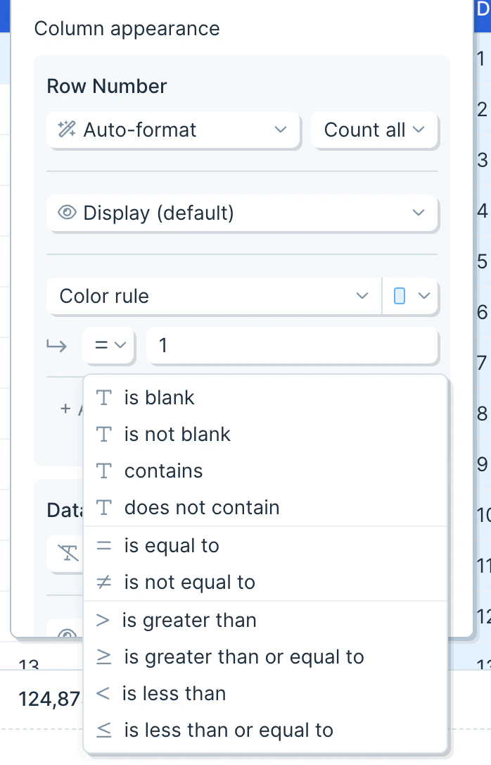 Uses a conditional rule to color specific cells. The following operators are supported: