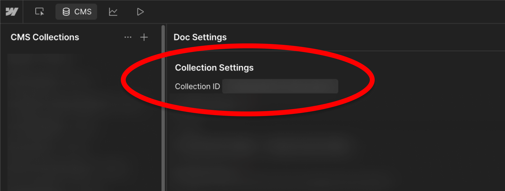 Replace the :collection_id section of the URL with a collection ID from your Webflow site. Collection IDs can be found in the Webflow Designer, at the top of the settings panel for that specific collection: