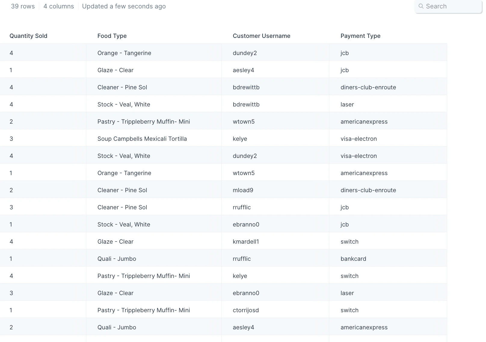 Our input data has 39 rows of order information showing the quantity sold, food type, customer username, and payment type per order.