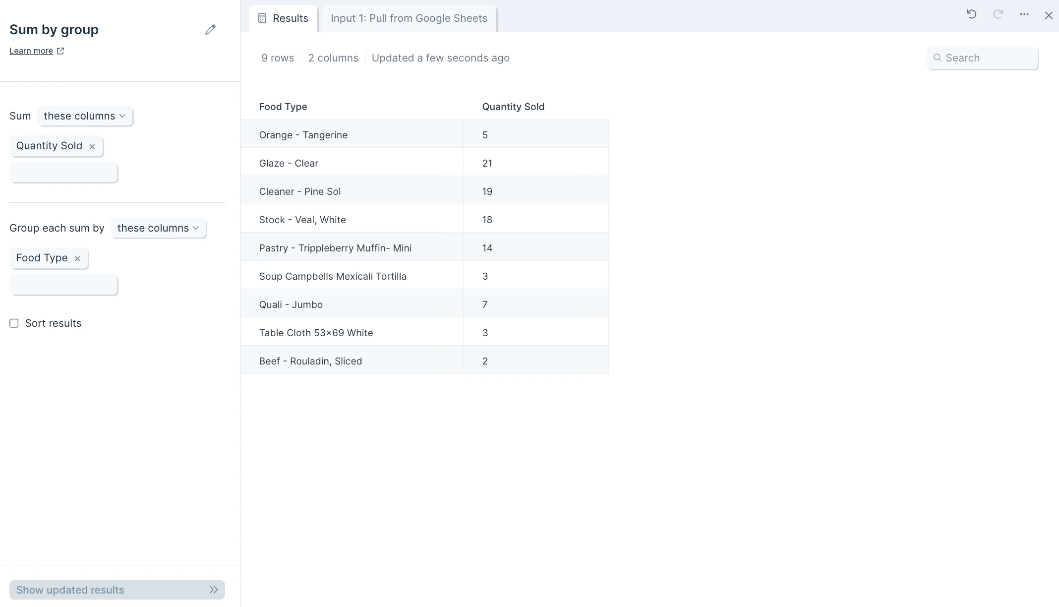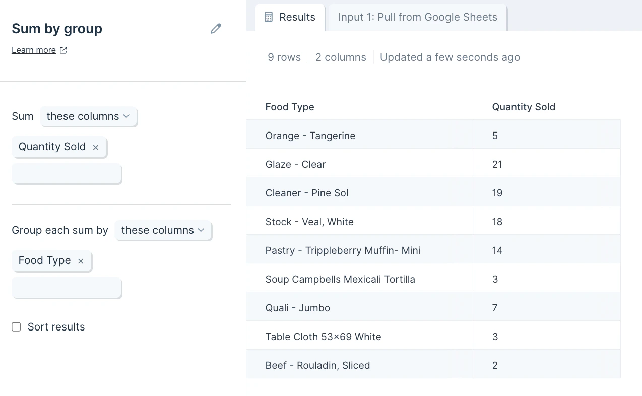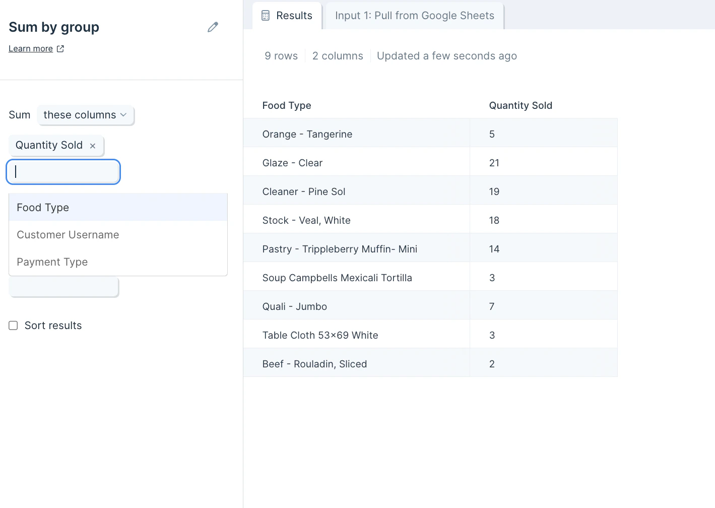 Once connected to your flow, this step will auto-select a column to find the total amount per data group/category like quantity sold per food type. The result will display your grouped values and the total sum of them as a new table.