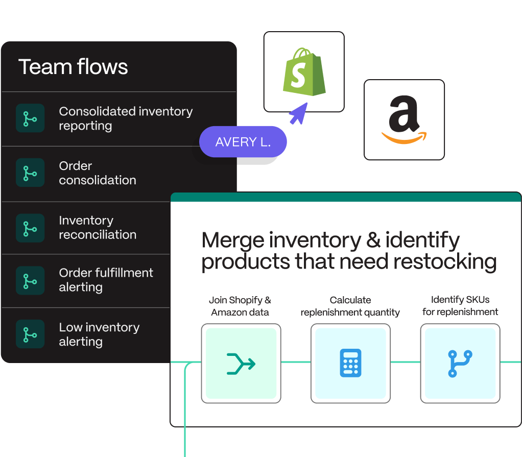 You can pull SKU-level data from systems like NetSuite, Shopify, and Snowflake, merge and transform datasets, and automatically flag discrepancies or low-stock items.