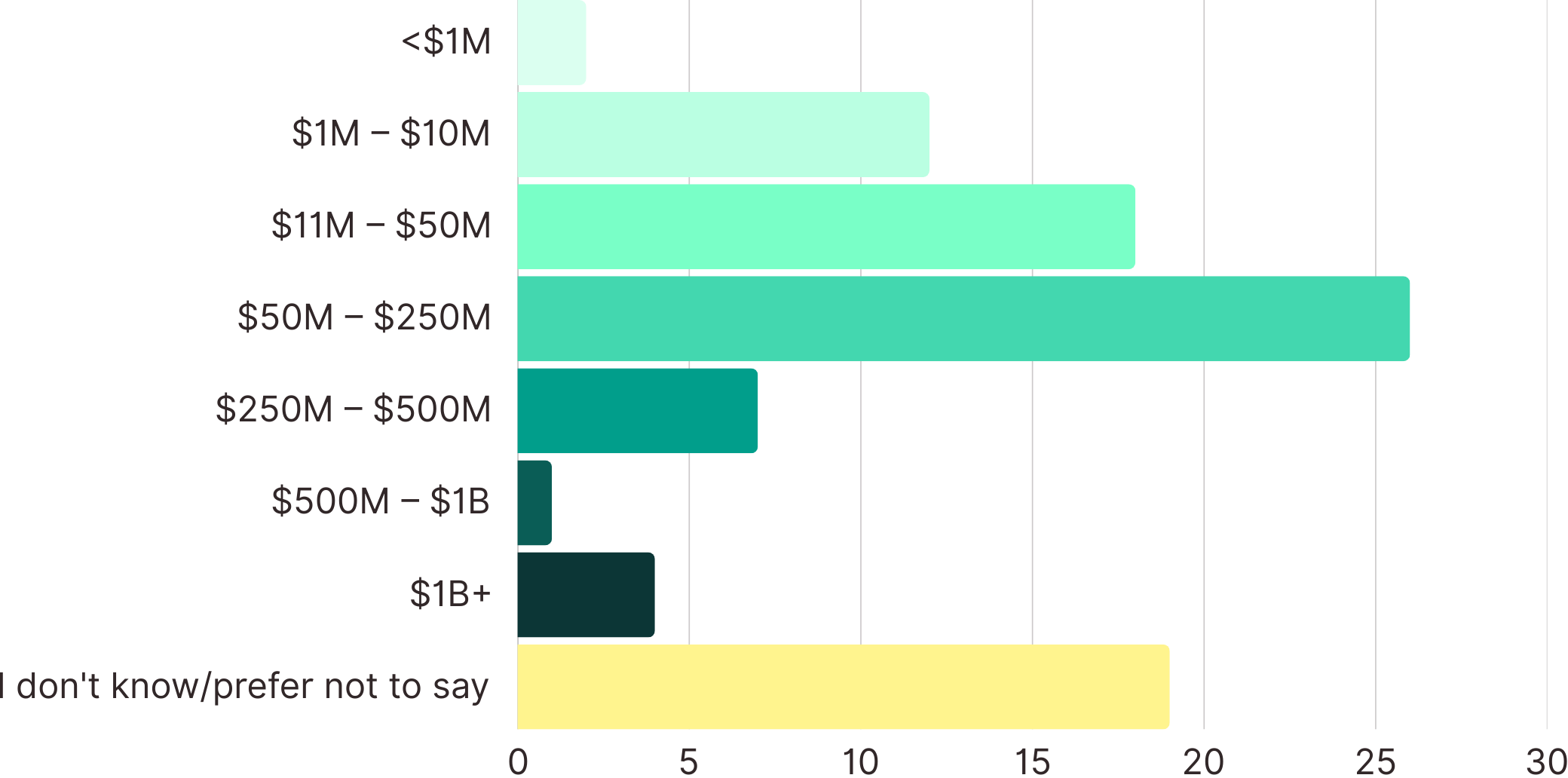 - Fraud prevention is a mid-market priority. 36% of fraud tool users fall within the $50M–$250M revenue range, while only 16% are small businesses.