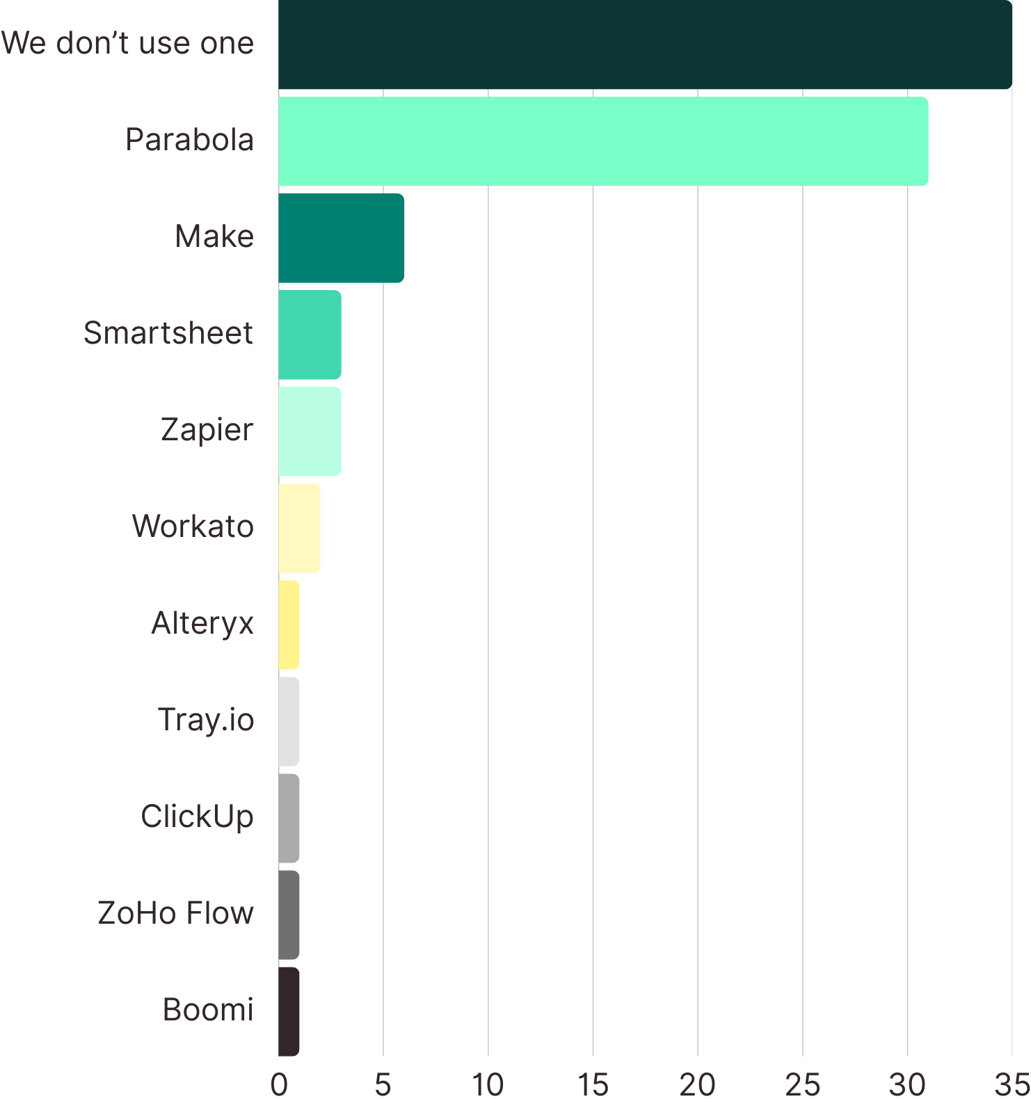 The majority of respondents in our survey use Parabola*, with Make, Smartsheet, and Zapier following behind.