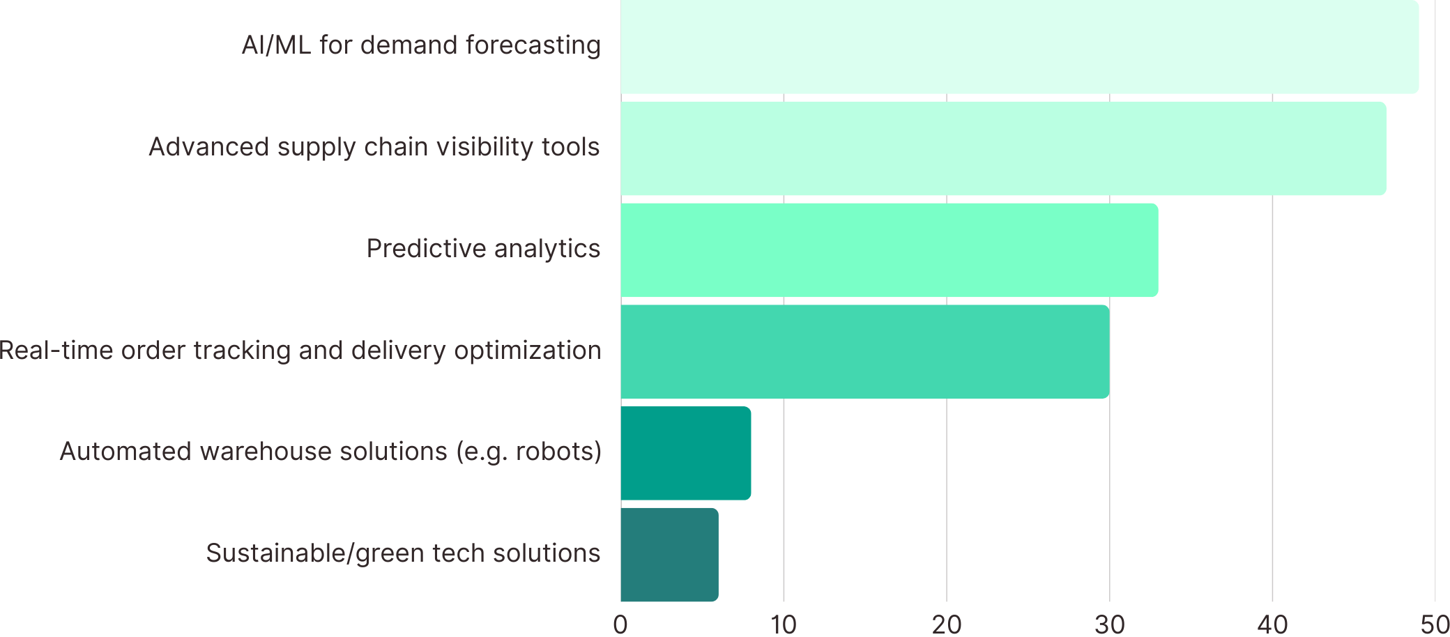 - Advanced supply chain visibility tools were cited by 53% as a key 2025 tech opportunity