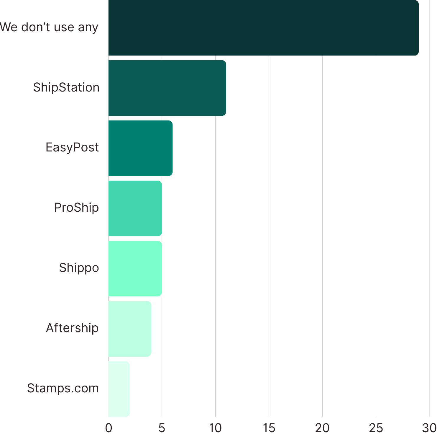 The majority of respondents use ShipStation (15%), followed by EasyPost (8%), ProShip (7%), and Shippo (7%).