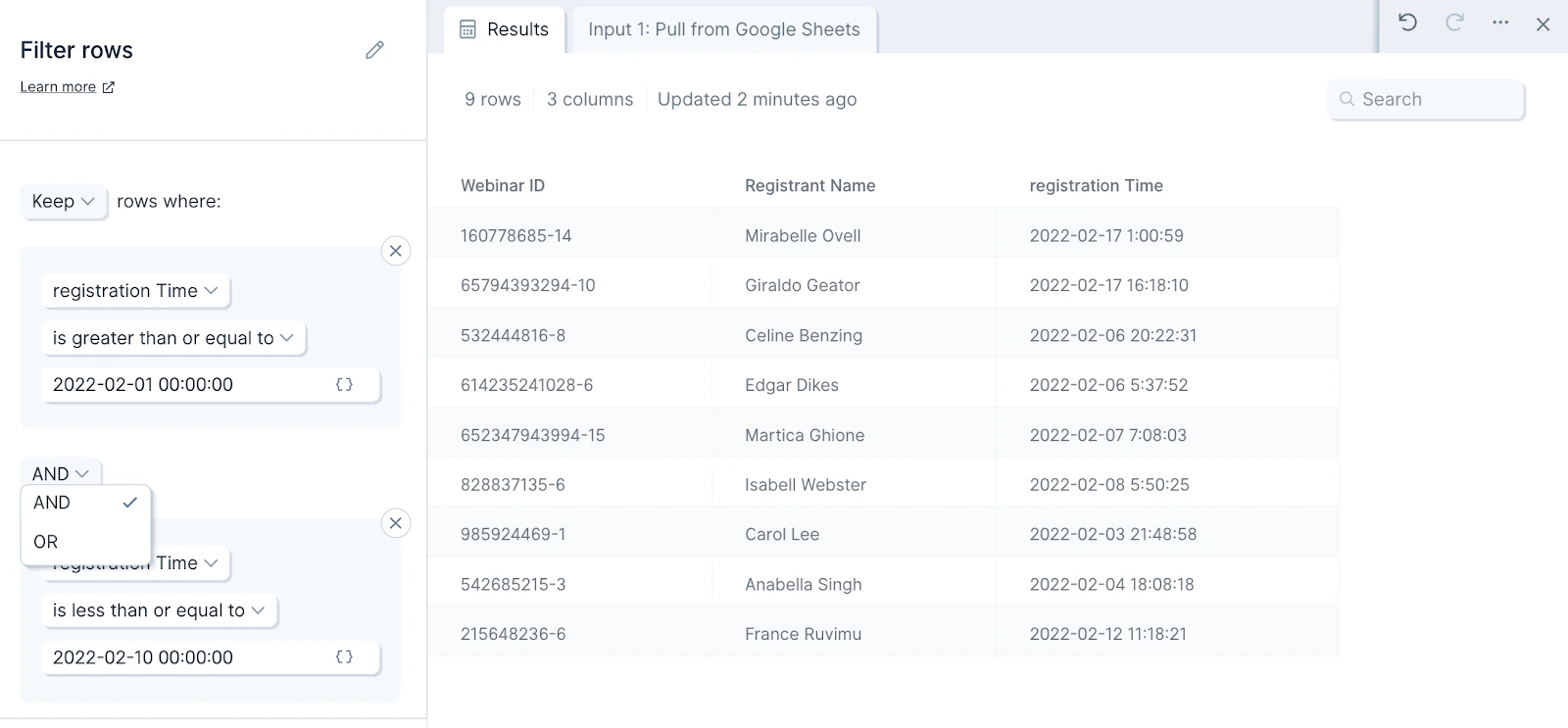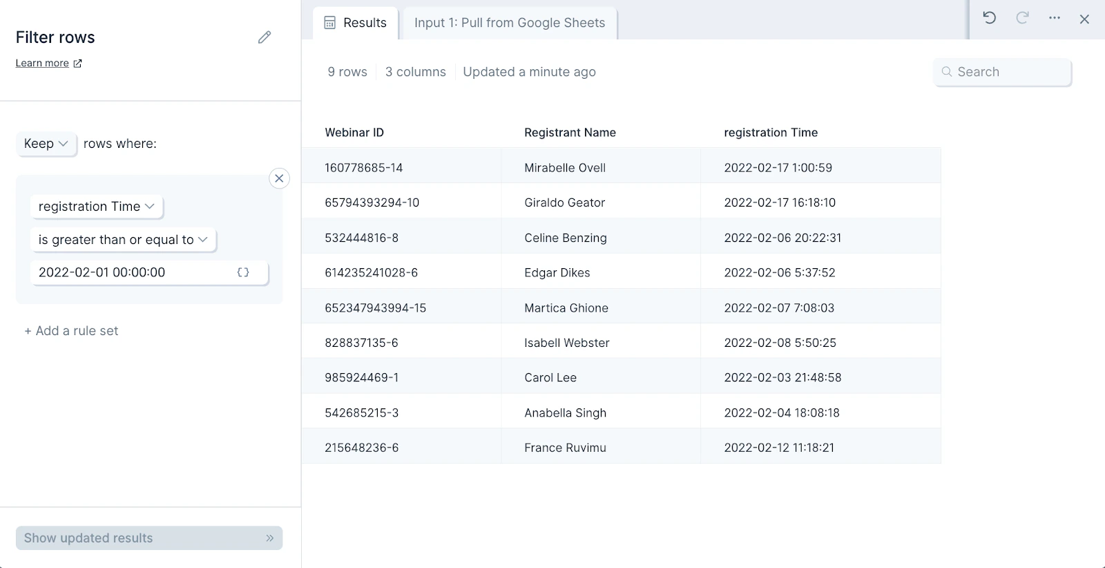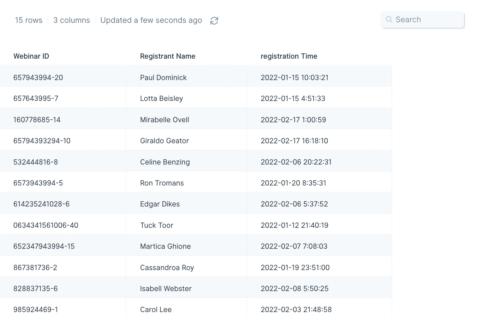 The input data we’ll connect to this step has 15 rows of webinar registrants.